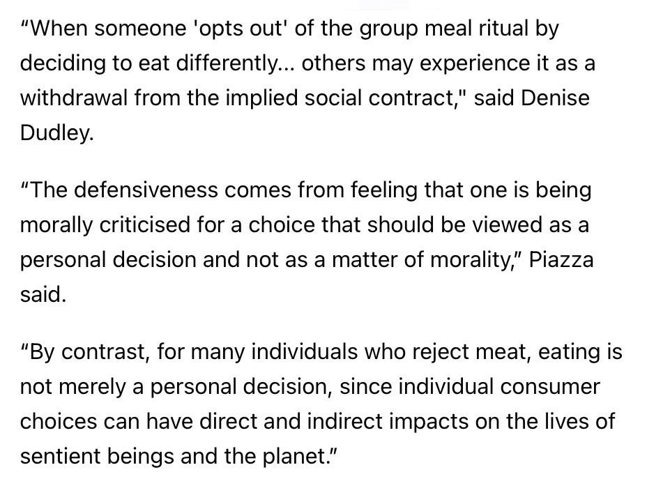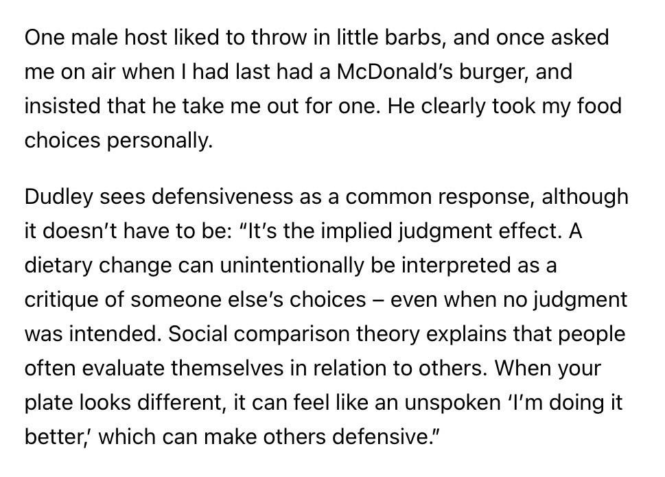 You can switch out vegan with Covid-cautious or literally anything from childfree by choice to cycling to neurodivergence to gender expression to chronic illness to disability and it’s always the same damn conformist defensiveness that we have to suffer. But instead of putting the onus on conformists to alter their social comparison behaviours, the rest of us are burdened with making every encounter a Very Special Episode of learning and tolerance of both sides.