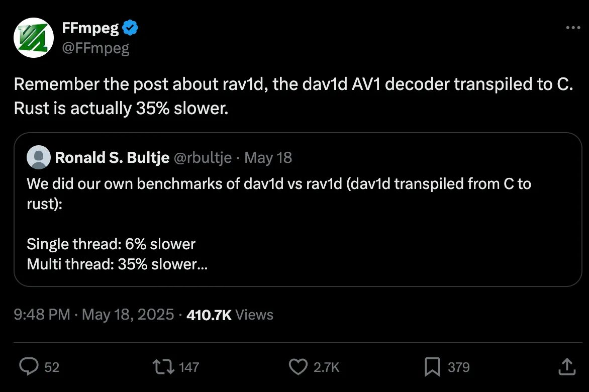 And nobody wants their video decoder to be slower by any percentage. Nobody is going to say "I want the slower version, because I care about memory safety". Literally nobody except Rust nerds.
