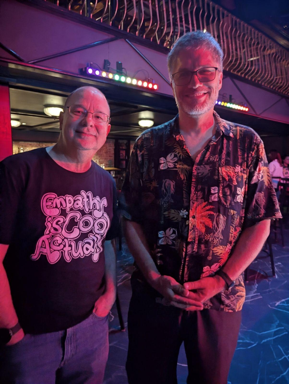 (edit to correct alt text for message John's shirt) Late final post for 11/08: @u2katrina and i did the Lit Crawl last night. After the session which John Scalzi closed out she boldly walked over to chat with John. Then waved me over (and immediately abandoned us!). John noticed after a minute and called her back over. 🙂 We had a great chat with him for a few minutes.