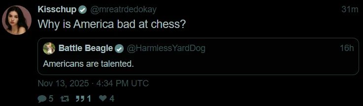 chess isn't popular in america, that's all there is to it. we're not going to win any cricket tournaments eitherJohnny Peligro likes this. -