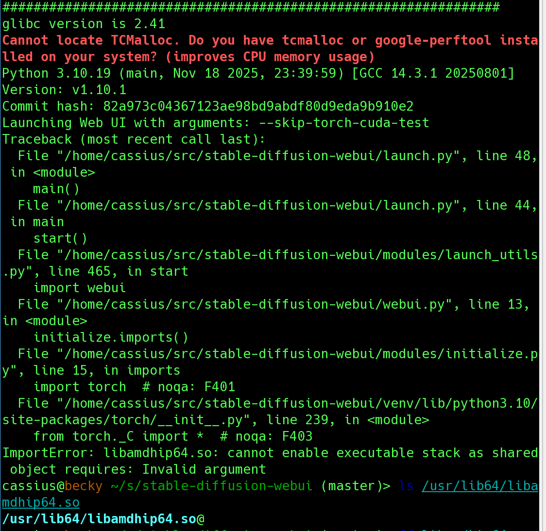 Was it a year ago? How did you get past ImportError: libamdhip64.so: cannot enable executable stack as shared object requires: Invalid argument?