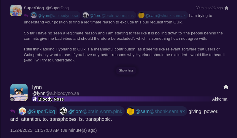 @taylan@fedi.feministwiki.org Guix didn't refuse commits from Hyprland. Why would they do that if the maintainer is behaving like a normal person in the Guix issue?