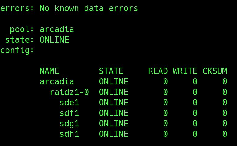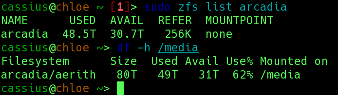 arcadia 13.6G 79.1T 256K none arcadia/storage 13.6G 79.1T 13.6G none -