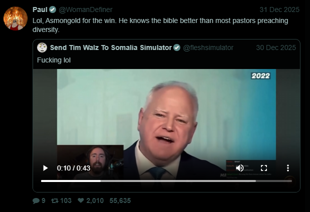 @TrevorGoodchild@sickburnbro Tim Walz is either retarded or a political genius because he's some sort of Manchurian Candidate fueled by diabeetus that got elected after defending our freedoms in the National Guard and committing actual treason for the Chinese. Perhaps the line between retard criminaloid and political genius is even thinner than the one between genius and insanity. It could be so thin that it's non-existent. Is he going to be publicly executed in the next Revolution Q or something?