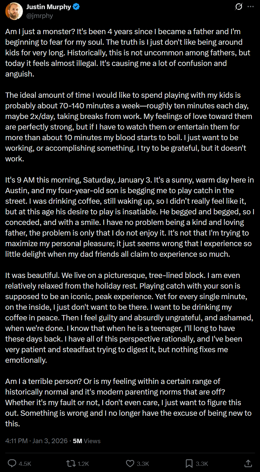 Those that talk about throwing ball with the kid as the pinnacle of fatherhood probably did it twice in a decade, weren't present much, and most likely didn't enjoy it when they were doing it. They just like remembering it.