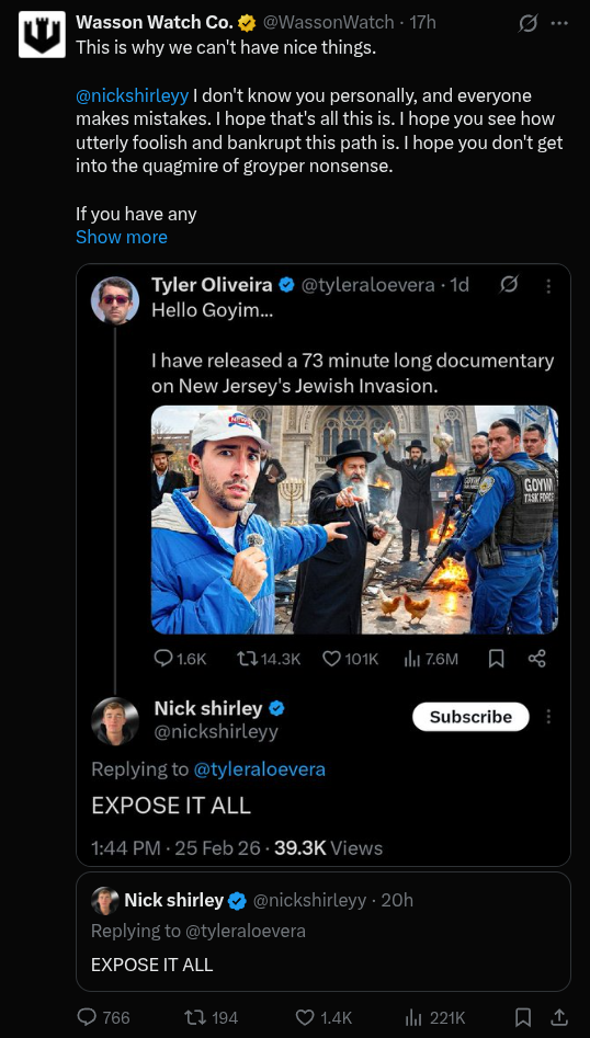 can we get a compilation of every "RW" account that has come out to simp for jews since Tyler's video? it seems that some marching orders went to to the shabbos goy brigade.