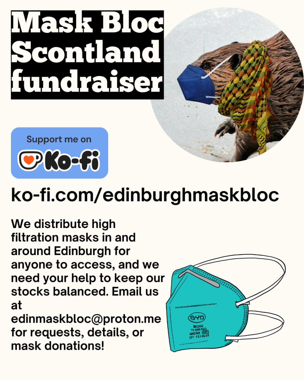 “We distribute high filtration masks in and around Edinburgh for anyone to access, and we need your help to keep our stocks balanced. Email us at edinmaskbloc@proton.me for requests, details, or mask donations!”