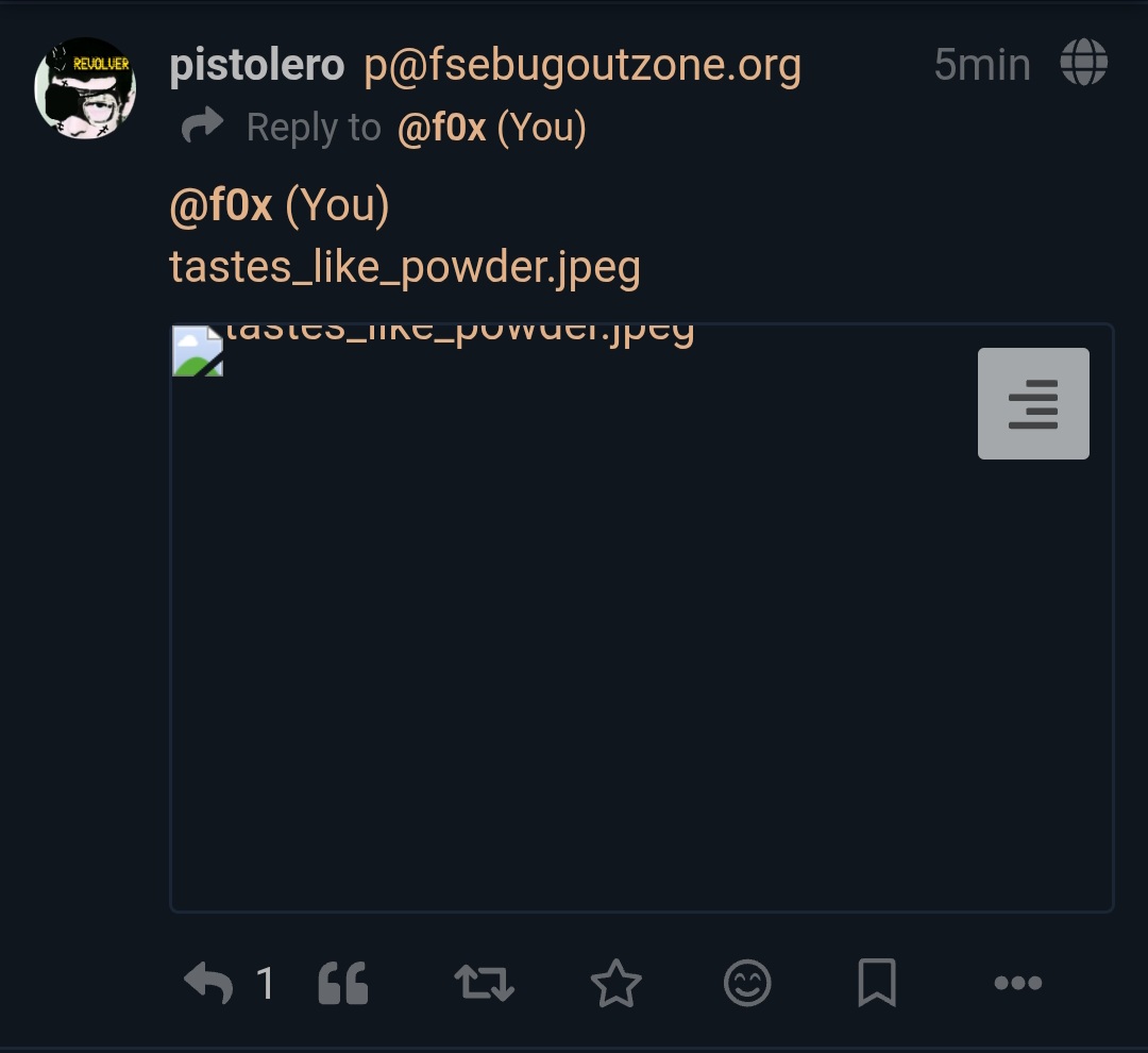 <blockquote style="position: relative; padding-left: 55px;"><section><a href="https://dsmc.space/objects/fd859fc4-c0fe-4364-8acd-28014cedfacd">Dymphna (f0x@dsmc.space)'s status on Saturday, 31-Jan-2026 15:16:26 JST</a><a href="https://dsmc.space/users/f0x" title="f0x@dsmc.space"><img src="https://gnusocial.jp/avatar/356766-48-20250804170909.webp" width="48" height="48" alt="Dymphna" style="position: absolute; left: 0; top: 0;">Dymphna</a><div><a href="https://dsmc.space/objects/0fe8dc6a-2f5a-4fca-85e9-0af3da69150f" rel="in-reply-to">in reply to</a><ul><li><li><a href="https://gnusocial.jp/user/356944" title="p@dsmc.space">p</a></li></ul></div></section><article><a href="https://dsmc.space/users/p">@p</a> <a href="https://fsebugoutzone.org/users/p">@p</a> all yer media looks like this on my end and has for a bit.<br><a href="https://media.dsmc.space/5b/ac/cc/5baccc1a3fbb1da37872cf3a36cdbe7badea9c30535f5de314f06561f5686653.jpg?name=Screenshot_20260130_230255_Brave.jpg"></a></article><footer><a rel="bookmark" href="https://gnusocial.jp/conversation/6110674#notice-12034035">In conversation</a><time datetime="2026-01-31T15:16:26+09:00" title="Saturday, 31-Jan-2026 15:16:26 JST">about 2 months ago</time> <span>from <span><a href="https://dsmc.space/objects/fd859fc4-c0fe-4364-8acd-28014cedfacd" rel="external" title="Sent from dsmc.space via ActivityPub">dsmc.space</a></span></span><a href="https://dsmc.space/objects/fd859fc4-c0fe-4364-8acd-28014cedfacd">permalink</a><h4>Attachments</h4><ol><li><label><a rel="external" href="https://gnusocial.jp/attachment/5741682">Untitled attachment</a></label><br><a href="https://media.dsmc.space/5b/ac/cc/5baccc1a3fbb1da37872cf3a36cdbe7badea9c30535f5de314f06561f5686653.jpg?name=Screenshot_20260130_230255_Brave.jpg" rel="external">https://media.dsmc.space/5b/ac/cc/5baccc1a3fbb1da37872cf3a36cdbe7badea9c30535f5de314f06561f5686653.jpg?name=Screenshot_20260130_230255_Brave.jpg</a></li></ol></footer></blockquote>