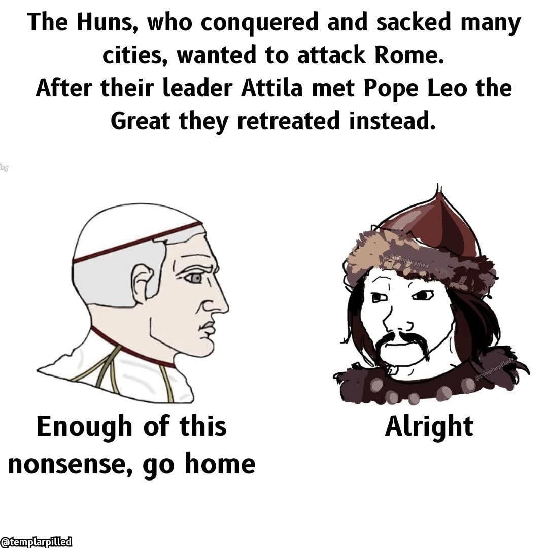 no one actually knows what Pope Leo the Great said to Attila the Hun to make him turn around In conversation from dirtyknight.life permalink Attachments
