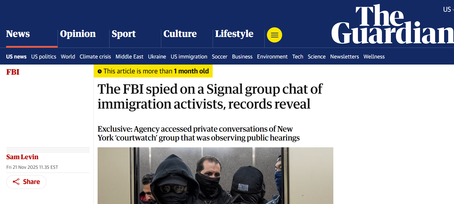 FBI is spying on private Signal group chats. The Guardian article from a few weeks ago going around is a terrible article full of hysterics with no concrete details or any sane idea of security, so don't give them the click and I'll try to do so myself.