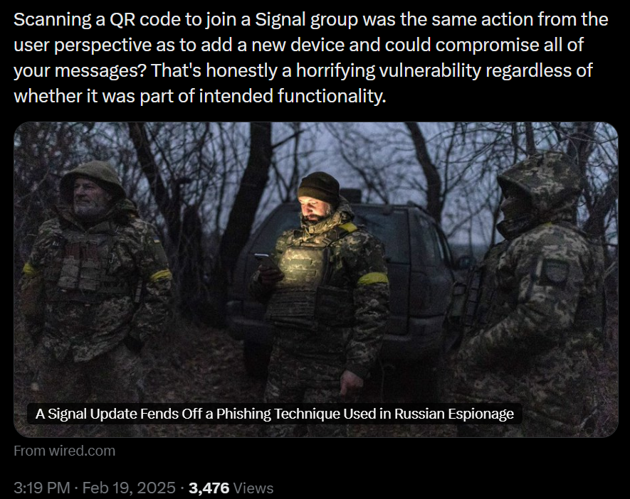 Someone in the group chat has a hacked phone or laptop with signal desktop, or once scanned a bad QR code and all their chats will forevermore be owned or maybe they're just giving logs to the FBI or someone in their apartment is. It doesn't really matter.