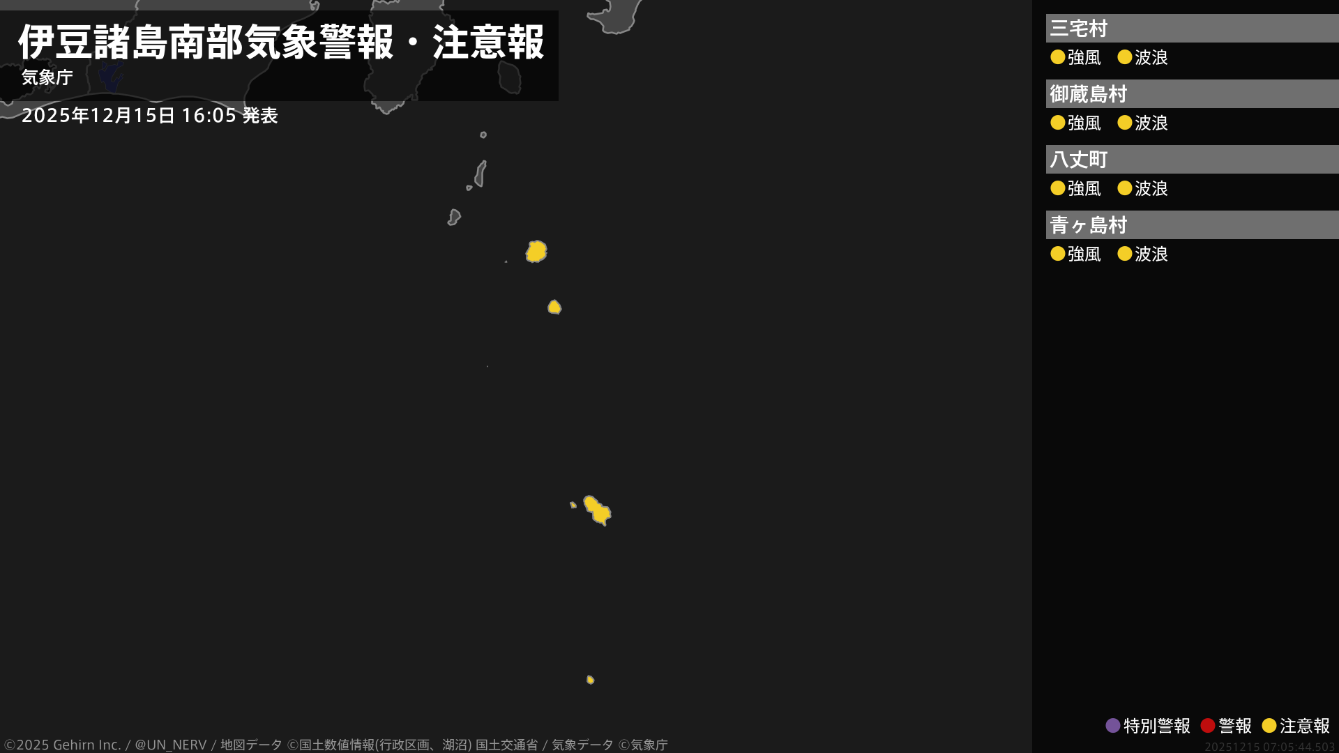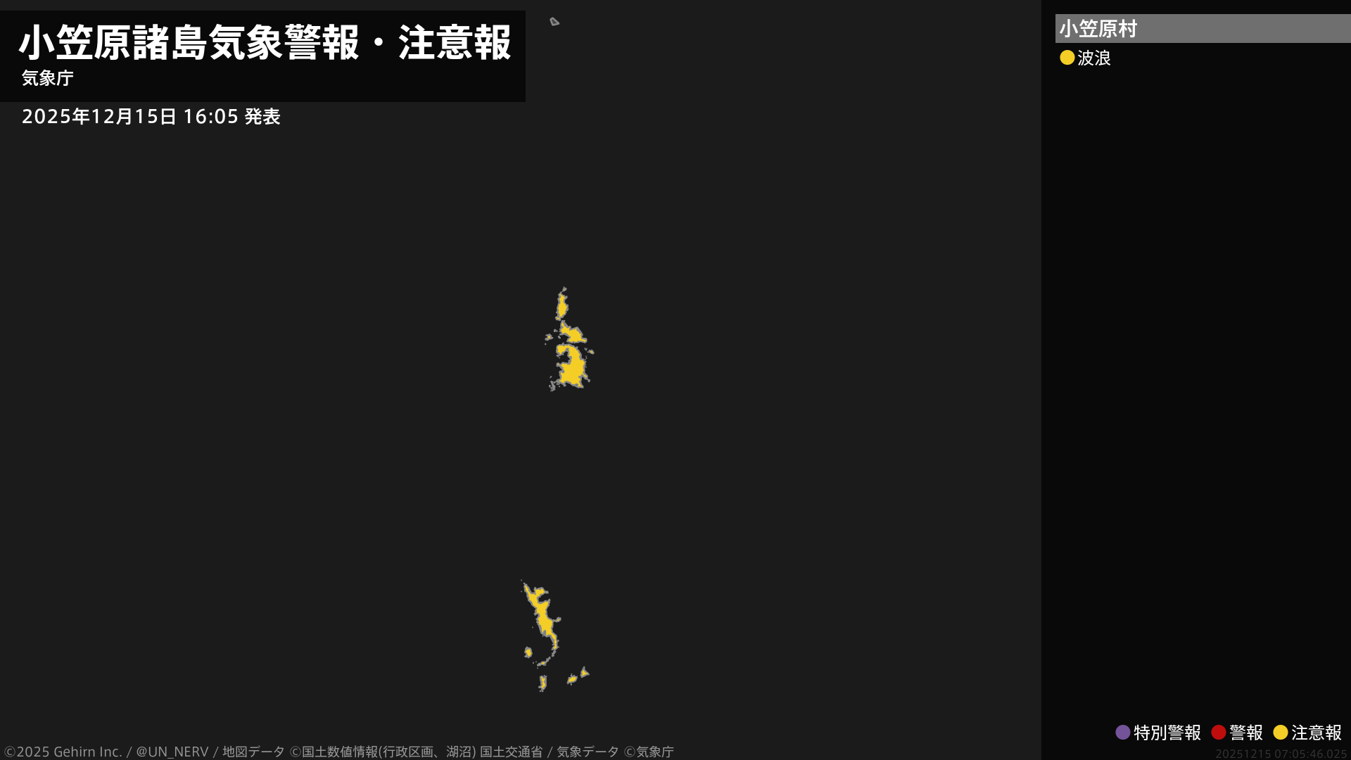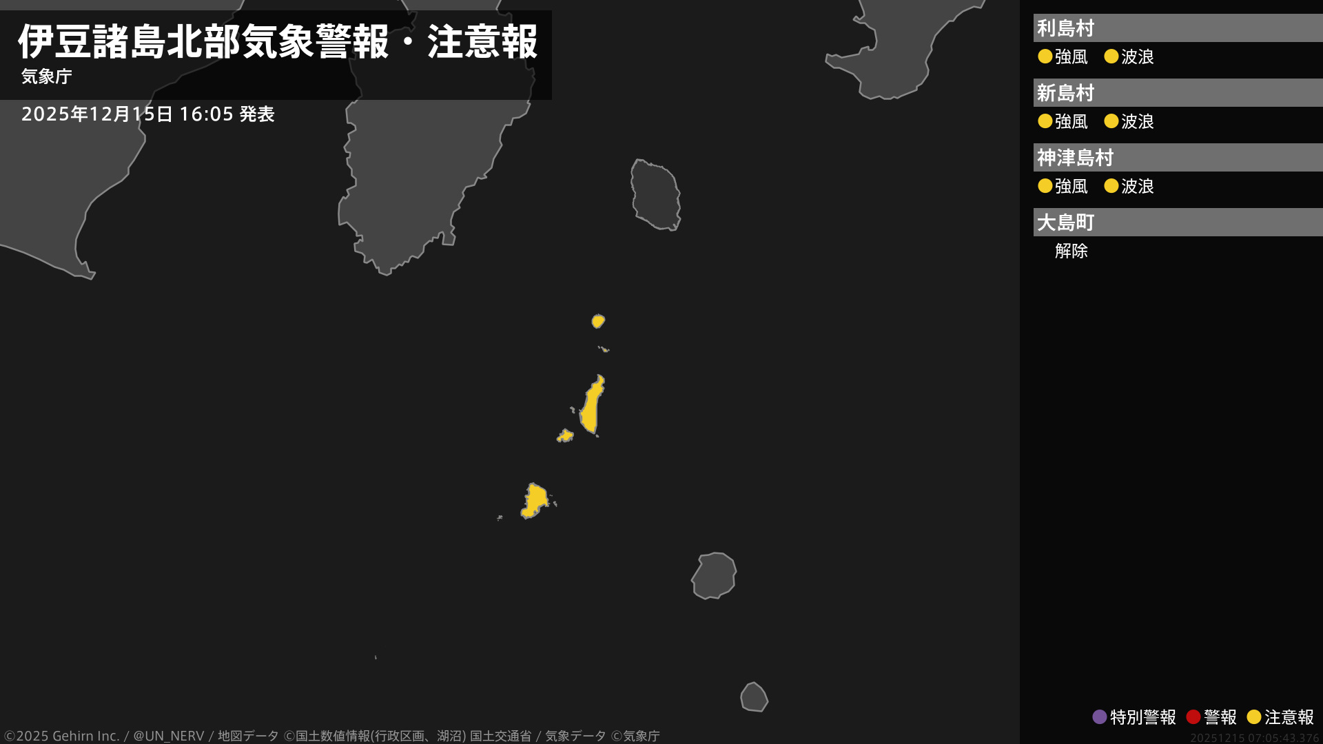 【東京都 気象警報・注意報 2025年12月15日 16:05】