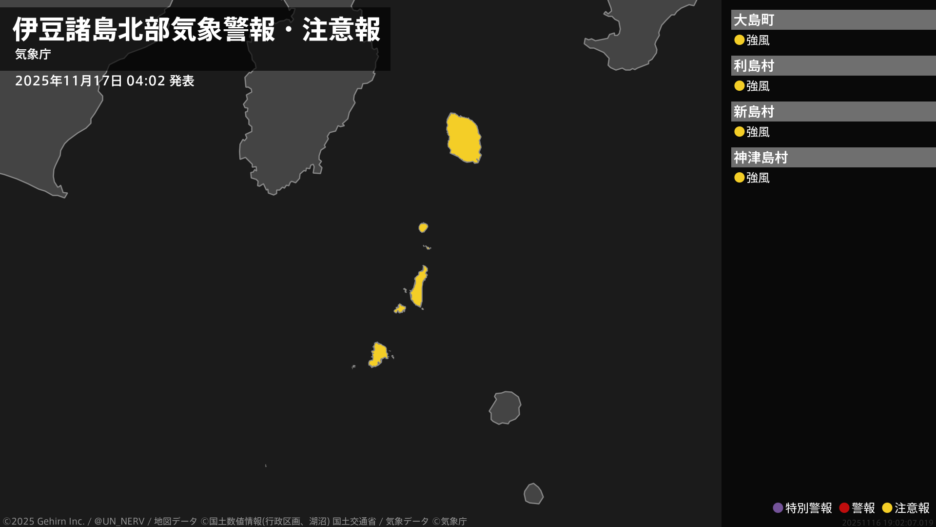 【東京都 気象警報・注意報 2025年11月17日 04:02】