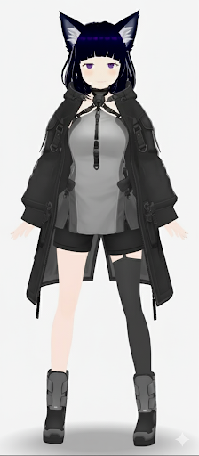,black hooded jacket, high neck zipper top, techwear inner, grey top, asymmetrical outfit, thigh strap, one leg dark gray stocking, hotpants, asymmetrical footwear, futuristic boots,