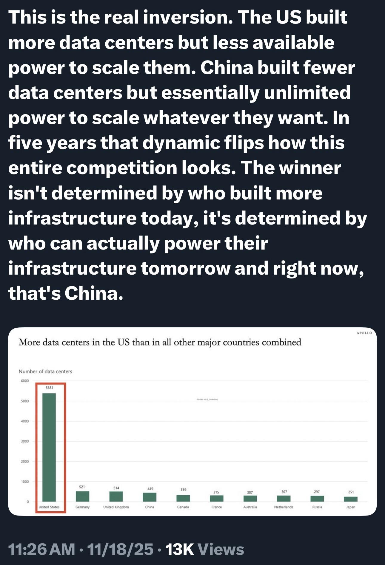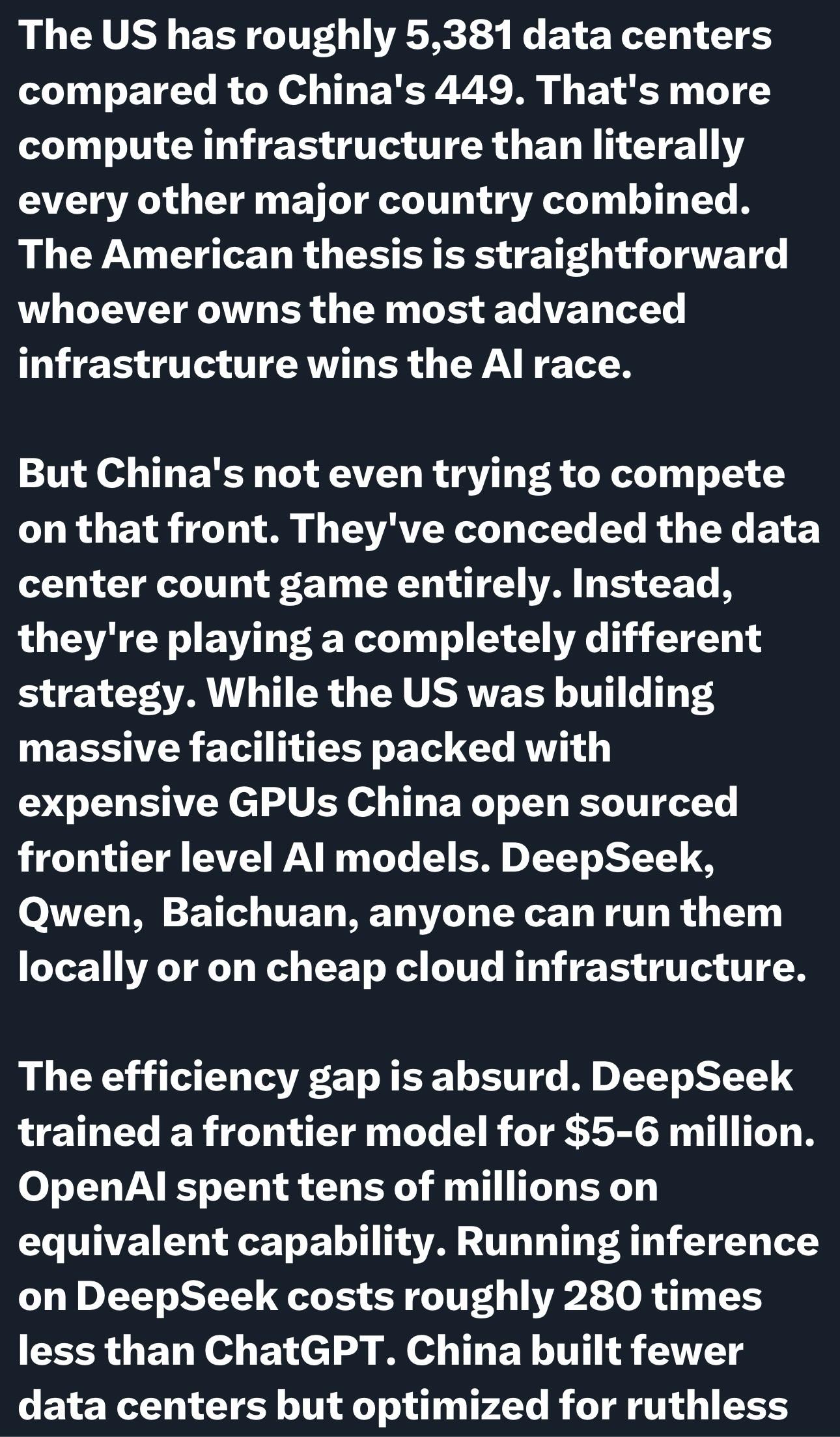 "US:🚨5,381 data centers comp to #China's 449. American thesis: most adv infra wins the #AI race.