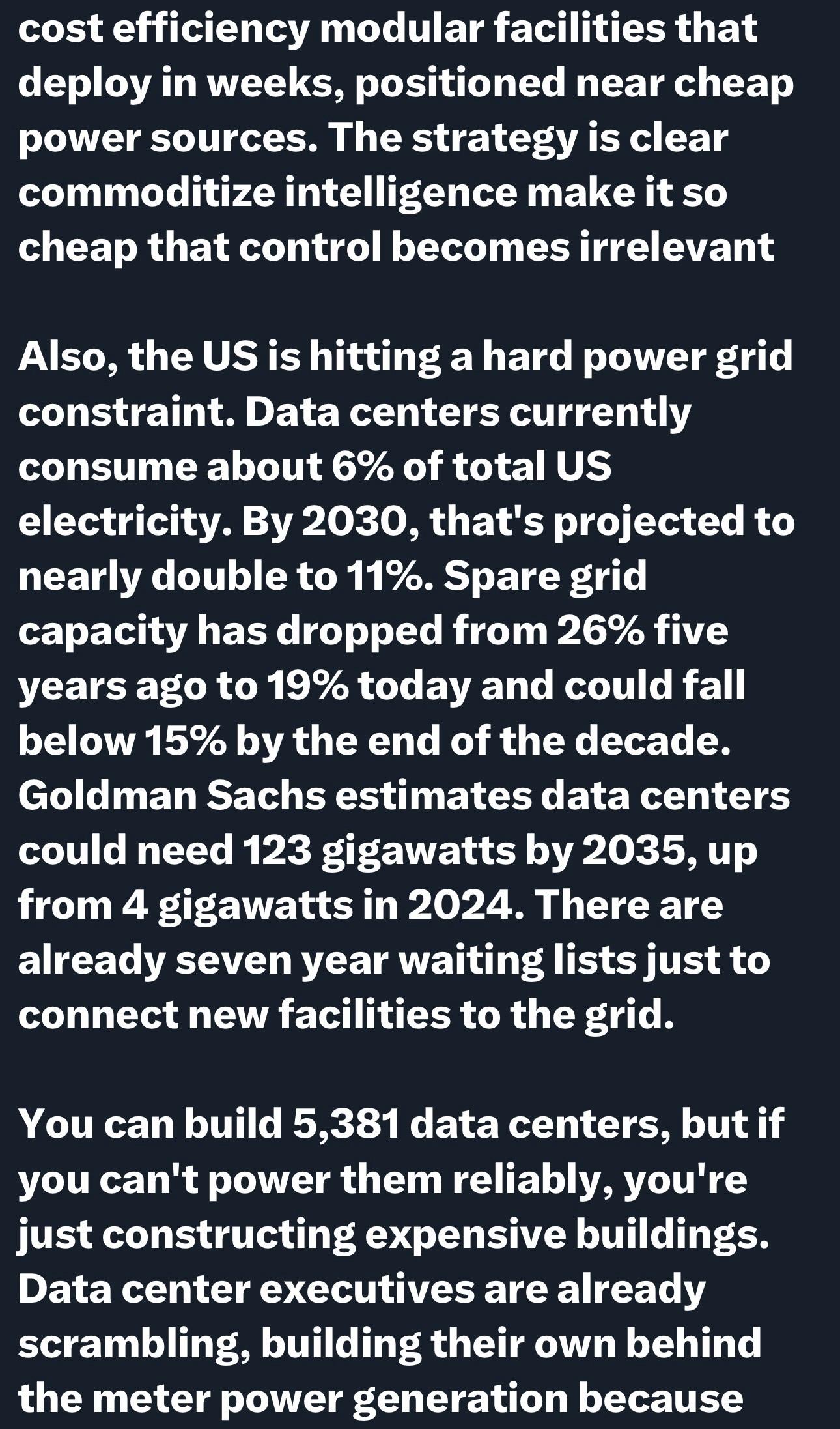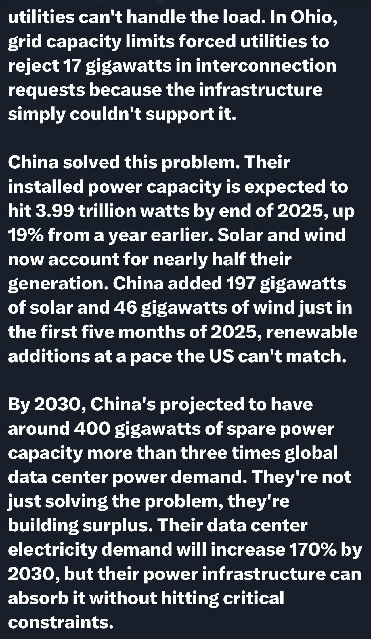 CN: diff strategy. While US:🚨bldg mass facs packed w exp GPUs w less power, CN open sourced frontier level AI models. DeepSeek trained a front model for $5-6M. OpenAI spent 10s of Ms on=capability. CN power cap: expected to hit⚡3.99T Ws *end of 2025 -solar & wind: nearly 1/2 their gen *added 197 GWs of solar +46➡️wind -1st 5 mos of 2025, renew adds -🚨US can't match."⬇️