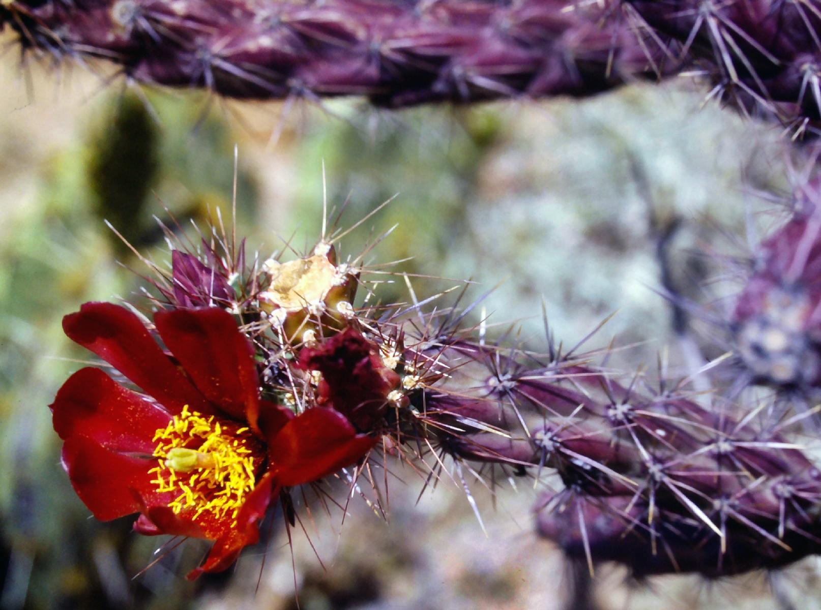 A walking stick cholla cactus in flower, Sonoran Desert, Arizona, in the midst of an unusually rainy spring. March, 1984.