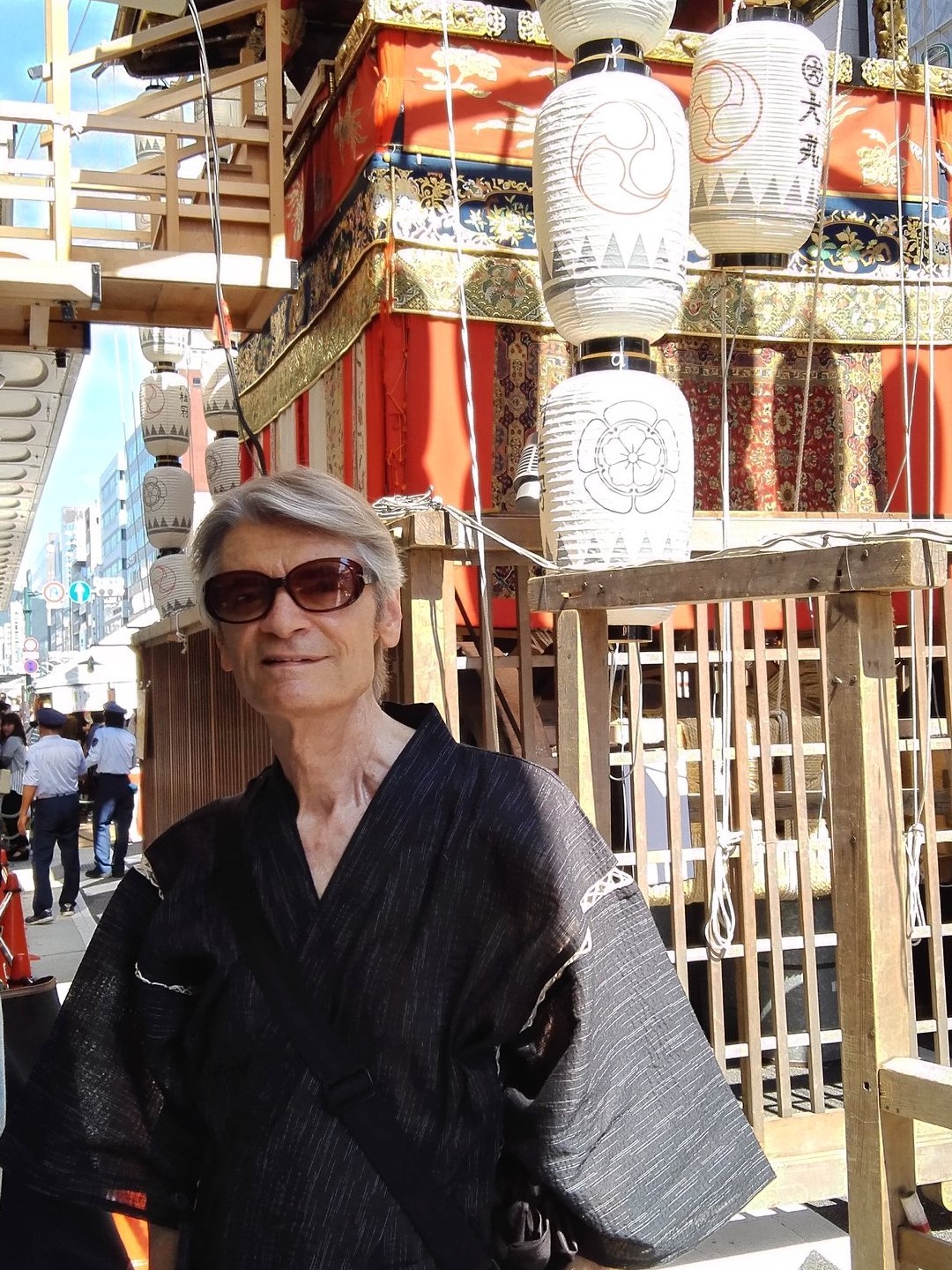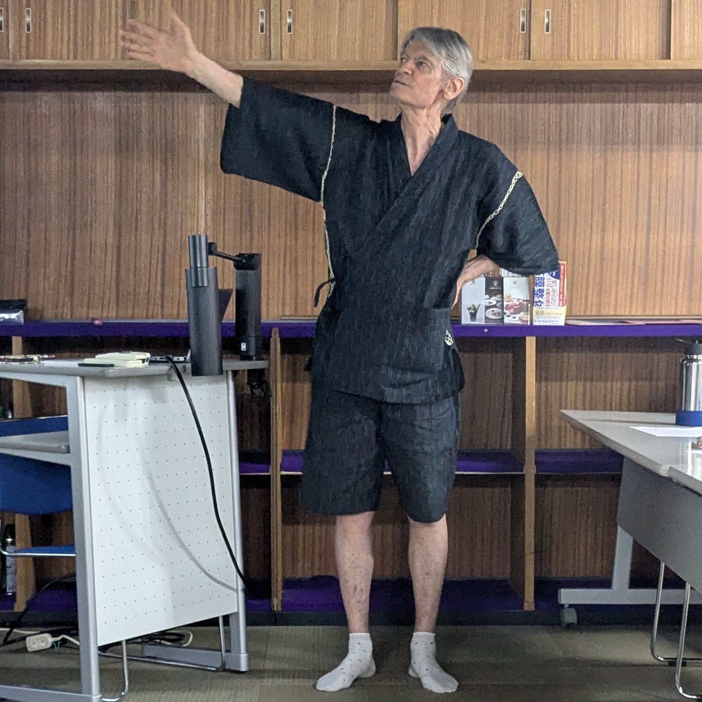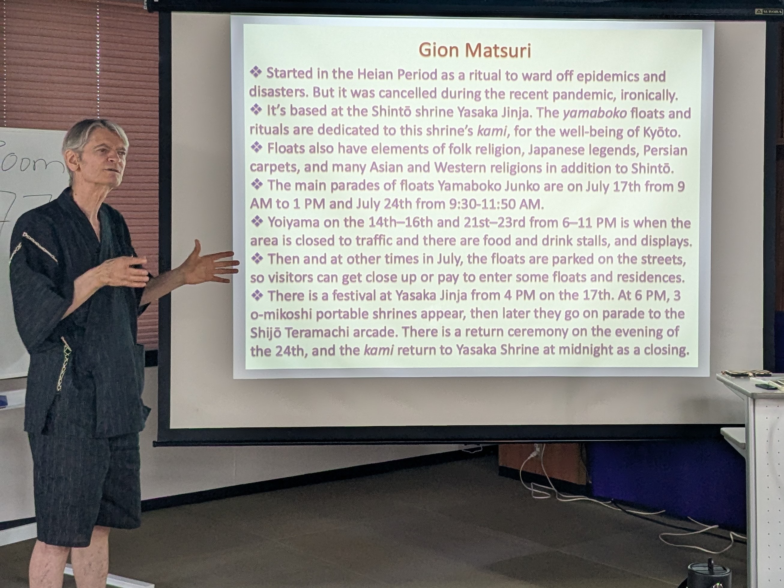 With permission I wore my festival outfit (甚平, jimbei) to give a presentation in Kyōto on "Gion Matsuri and Japanese Festivals"! After dressing professionally for 105 different academic presentations, this was the first time to cosplay! I love trying new or mischievous things. Cosplay was actually one of the discussion topics along with traditional Japanese clothing. There was a balance of lecture, group discussions, and many questions that I had welcomed. Many of the California college students, here briefly to study abroad, sincerely thanked me afterwards, with words like "awesome." I went all out to prepare the slideshow and to delight the audience with both depth and humor.