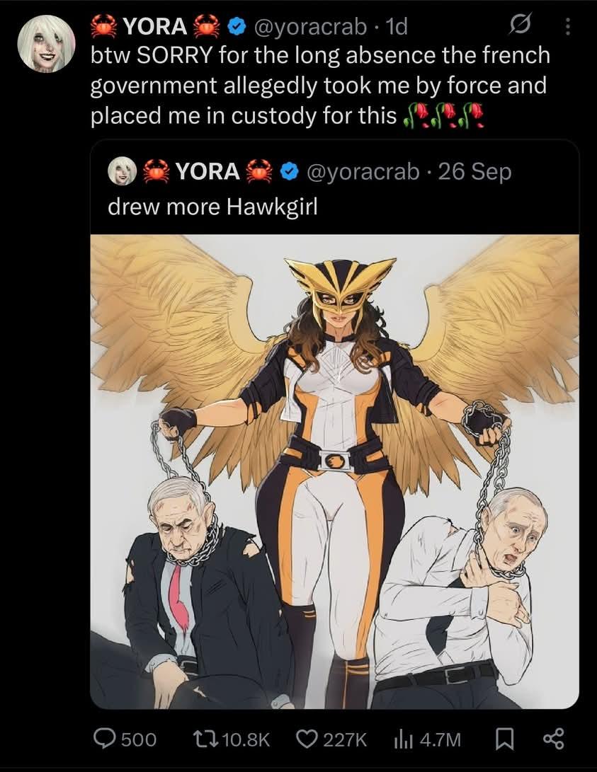 In case you didn't see the recent Superman movie, it featured a dictator who was an awful lot like Netanyahu and/or Putin. Hawkgirl dropped him from a great height, presumably to his death.