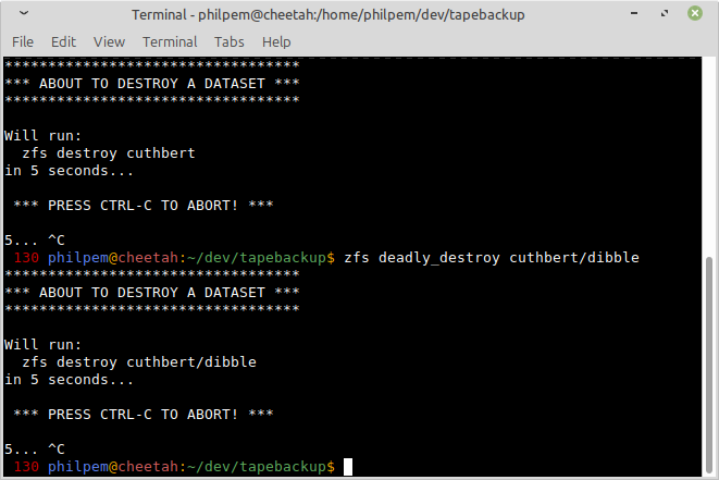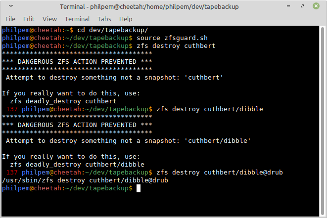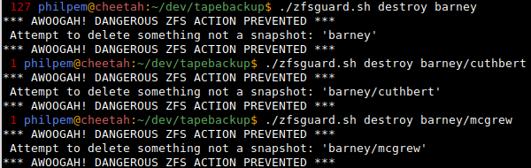 This, irony of ironies, was while I was writing a backup script, which went awry. (it passed the dataset name without "@snapshot" to "zfs destroy")IMHO, if "zpool/foo@bar" nukes a snapshot but "zpool/foo" or "foo@" nukes an entire dataset, that's a terrible user interface.