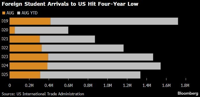 Foreign student arrivals to the US have hit a four-year low, per Bloomberg: