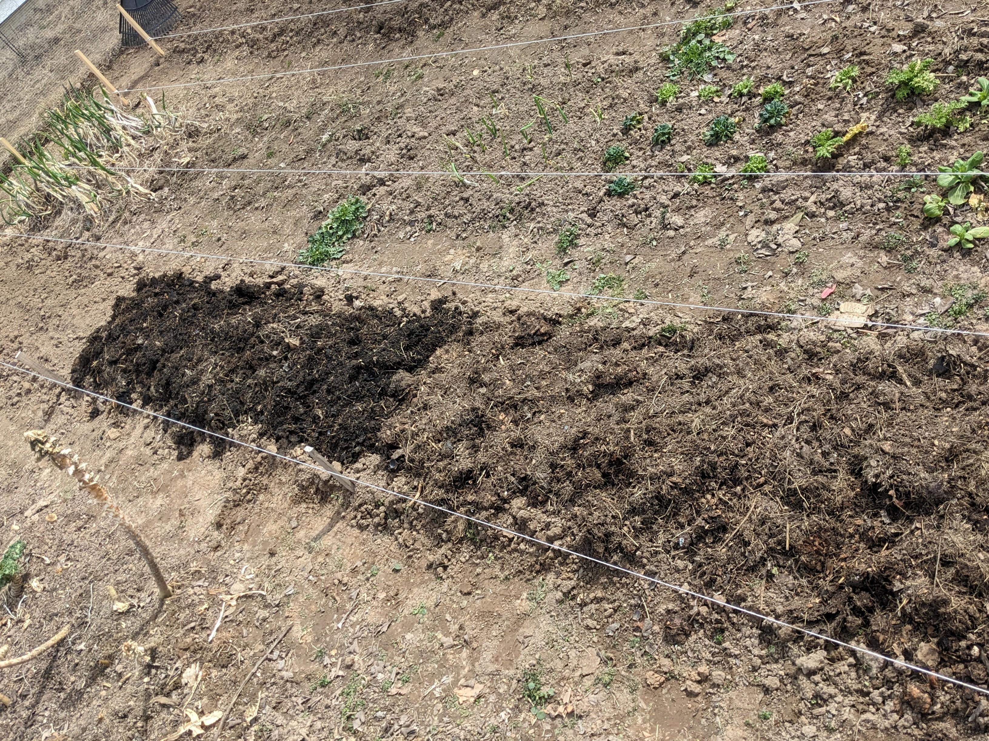 setting up my biochar trial. 1/3 of the bed has compost and 1/3 has compost + 5 gallons of crushed lump charcoal that's been sitting together all winter to inoculate. Going to see how the same sets of seedlings do in each section