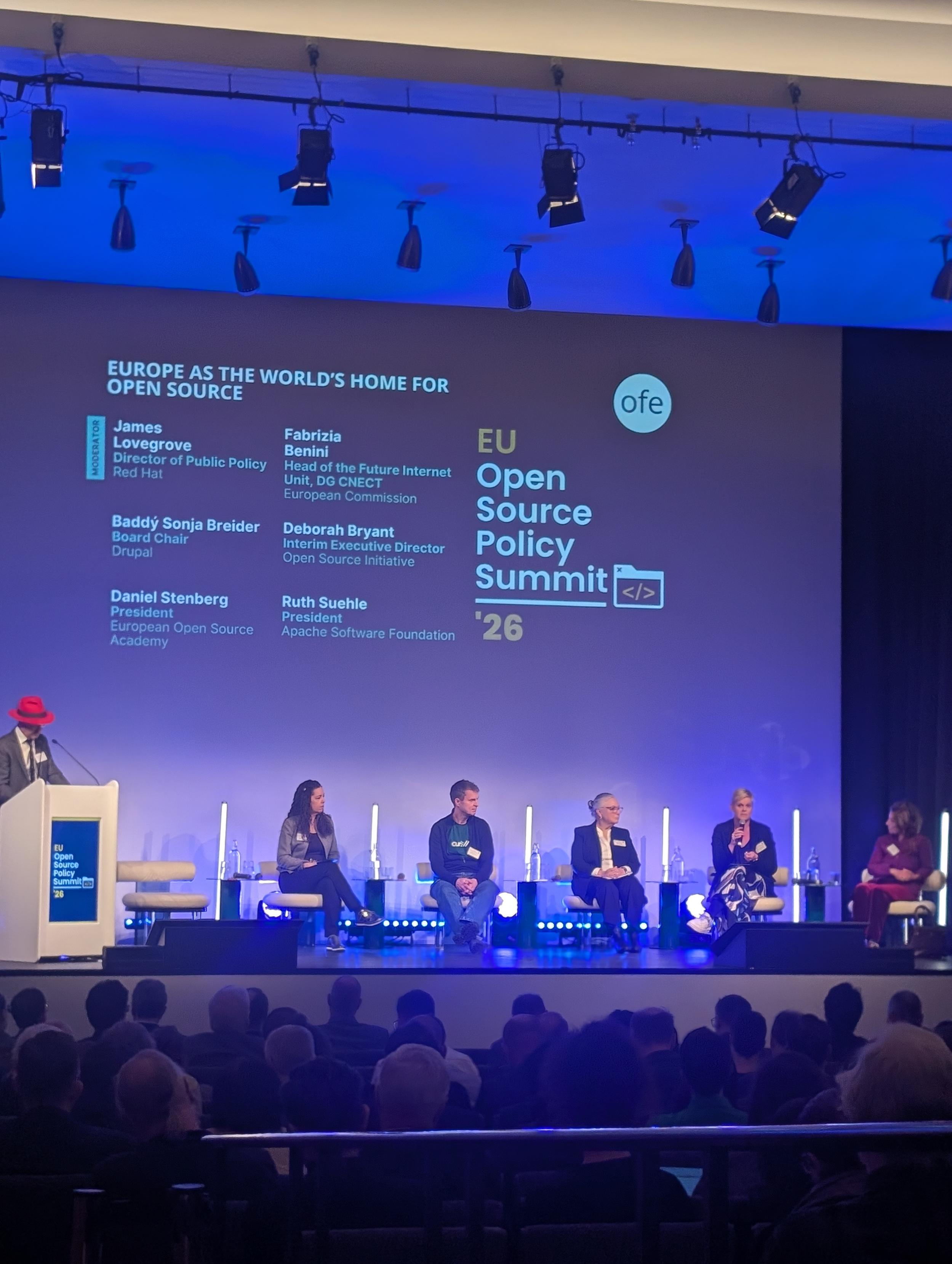 And now for a panel provocatively titled "Europe as the world's home for Open Source", moderated by the venerable James Lovegrove from Red Hat. #OSI is very well represented with our ED, Deb Bryant and board member and Apache President Ruth Suehle!