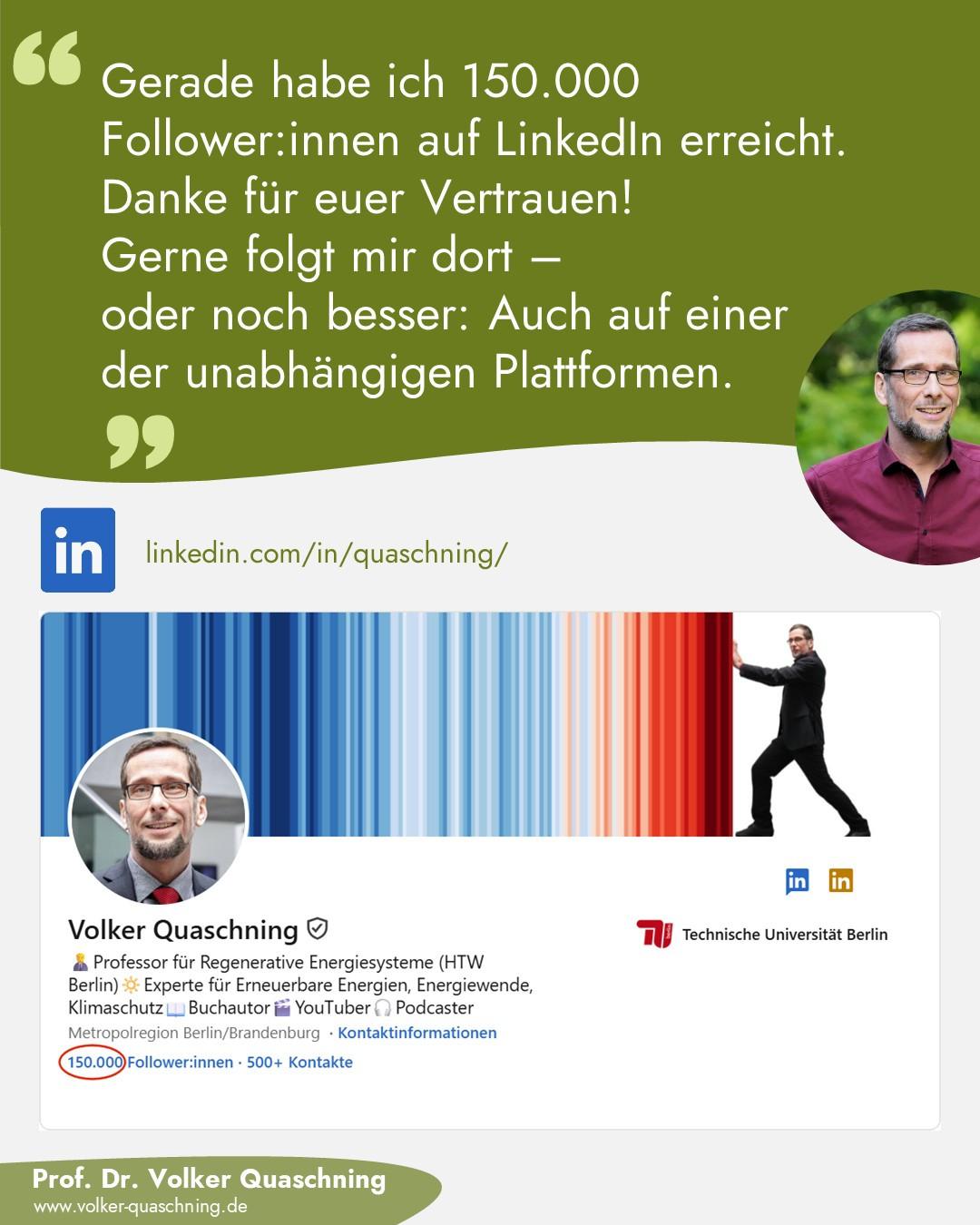 Es freut mich sehr, dass die Zahl meiner #Follower:innen auf allen Social-Media-Plattformen stetig steigt. Bei #LinkedIn habe ich jetzt die 150.000 geknackt 🍾 Danke für euer Vertrauen! 🙏 Gerne folgt mir dort. Helft aber auch mit, unabhängige soziale Netzwerke zu stärken 💪 – denn vermutlich werden wir diese irgendwann sehr dringend brauchen.