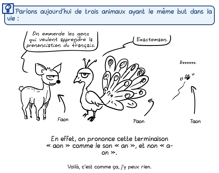 Une BD assez courte sur ces trois animaux si particuliers que sont le faon, le paon et le taon…