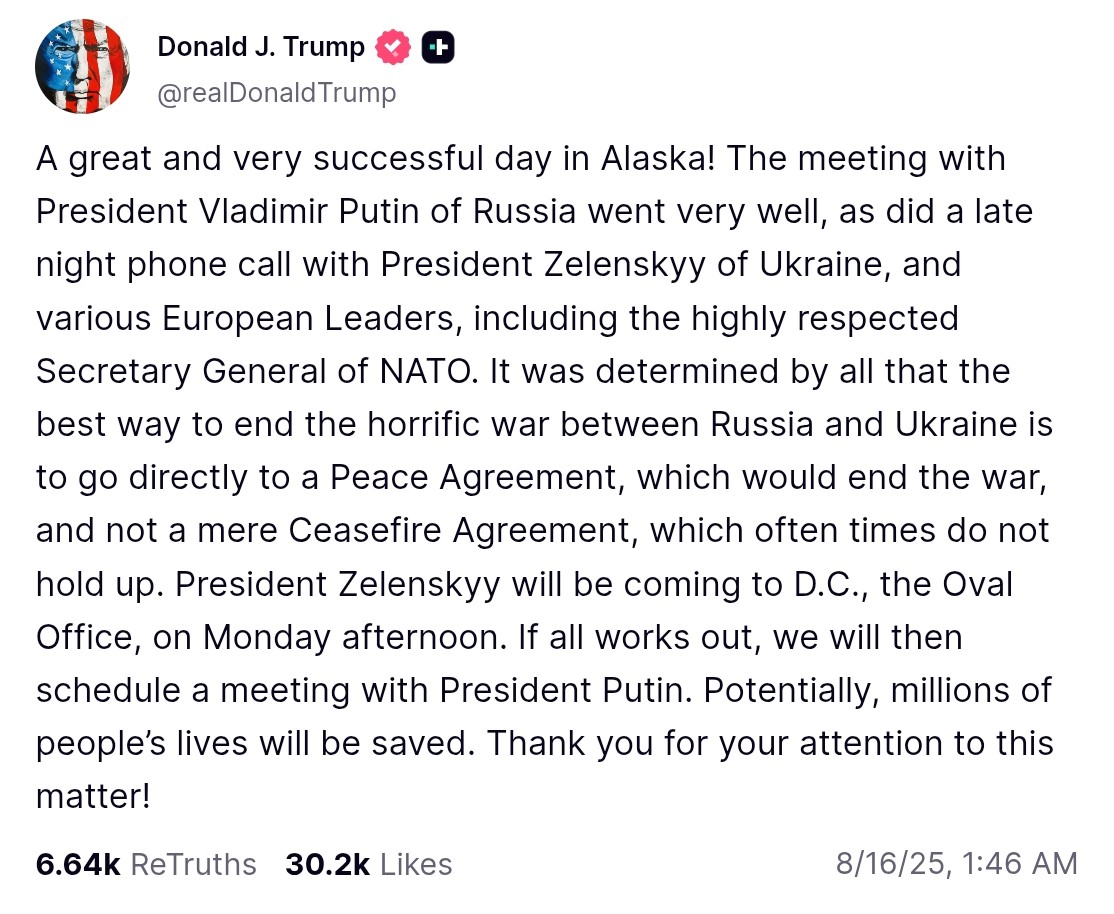 Trump has more leeway on the latter than former, but he's distanced himself from Putin’s terms, acting like it's all up to Zelensky. When they meet on Mon, I wonder if he'll still portray it all this way, but so far it seems Putin failed to enlist Trump in his grander effort to roll back post-1991.