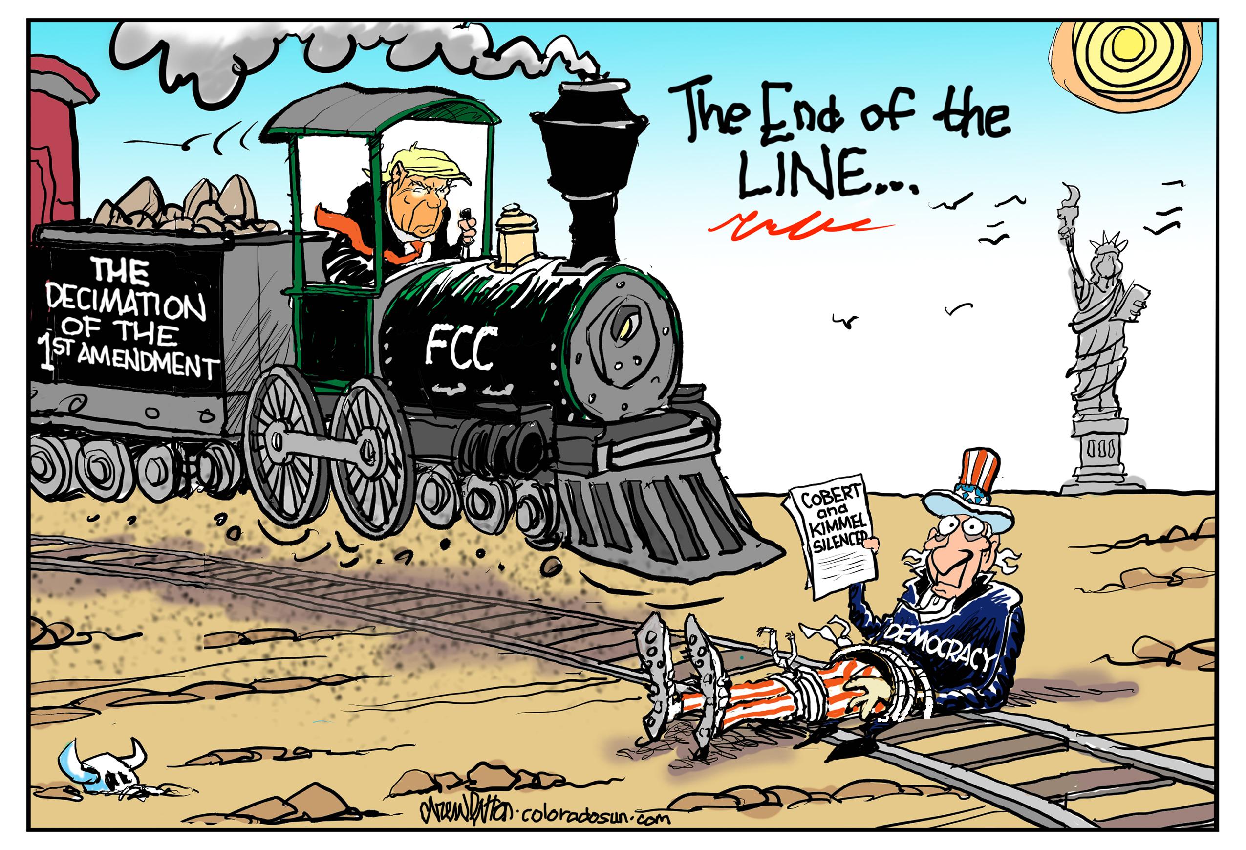 An opinion from cartoonist Drew Litton. https://coloradosun.com/2025/09/19/drew-litton-trump-railroading-free-speech/