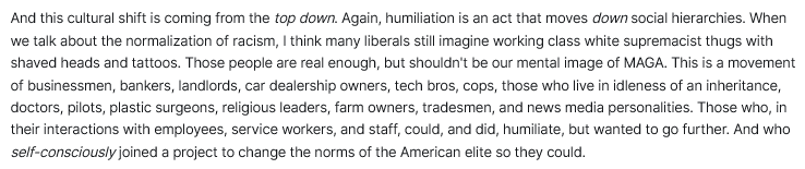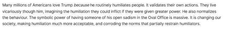 In this interesting essay, a political philosopher analyzes humiliation: Who thrives on dominating others, and what social structures enable it? "Anger at humiliation is a significant driver of left-populism," he argues, whereas the desire to humiliate others is a key feature of right-populism (MAGA):
