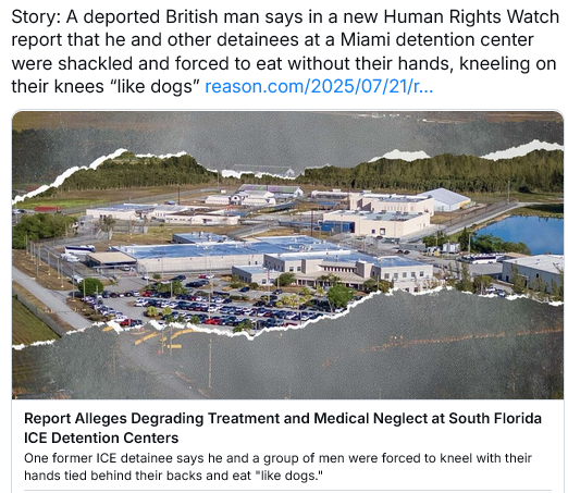 Story: A deported British man says in a new Human Rights Watch report that he and other detainees at a Miami detention center were shackled and forced to eat without their hands, kneeling on their knees “like dogs” https://reason.com/2025/07/21/report-alleges-degrading-treatment-and-medical-neglect-at-south-florida-ice-detention-centers/ [contains quote post or other embedded content]