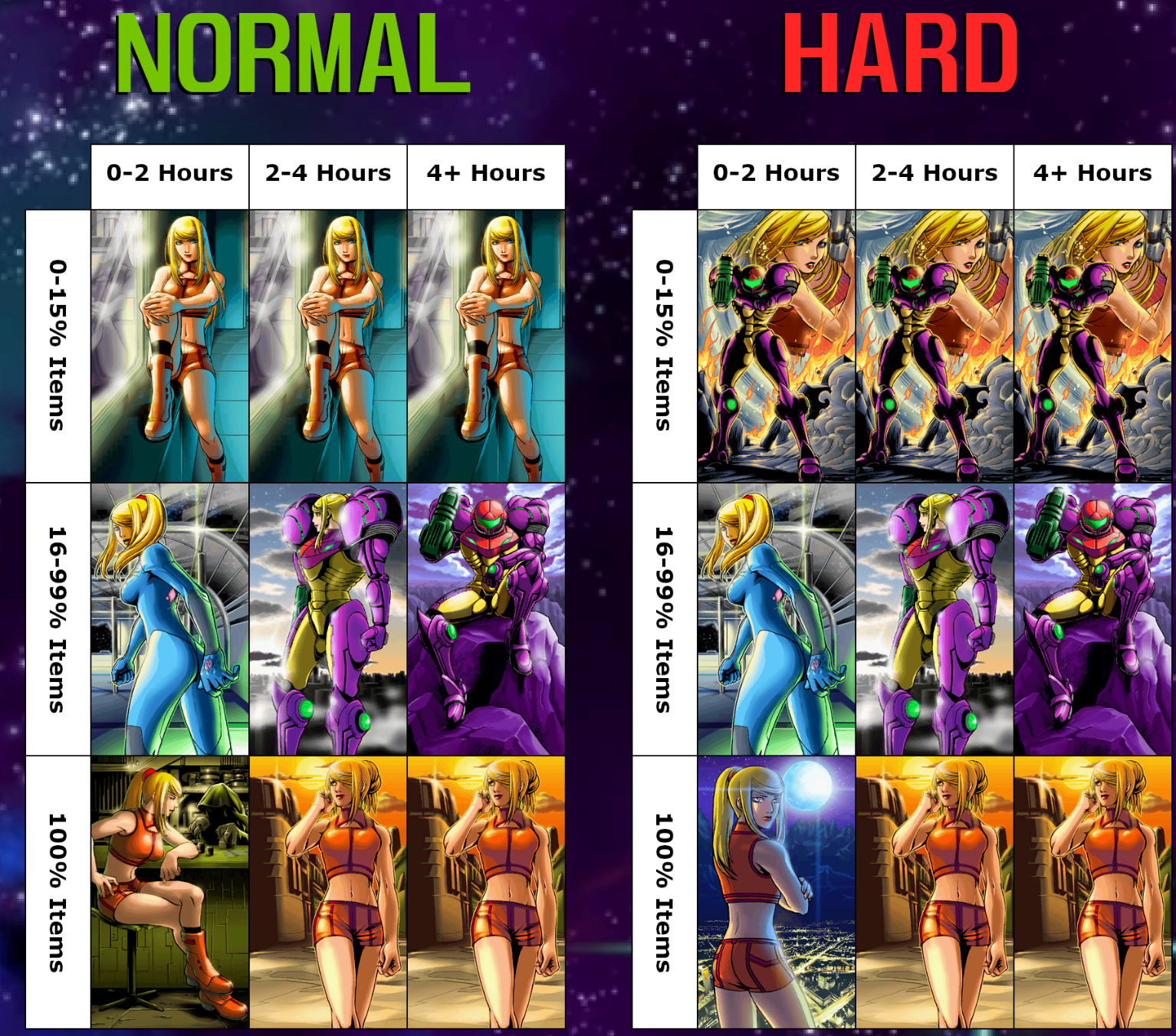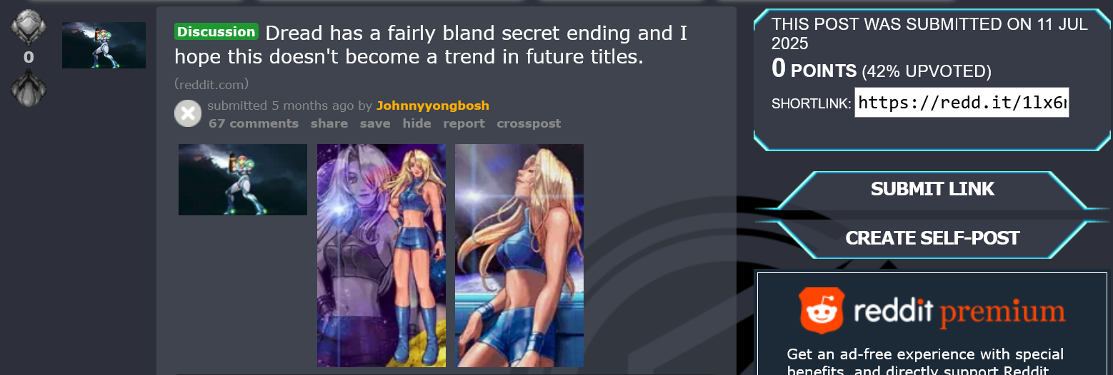 Dread does gives you some decent drawings for beating the game on normal/hard in different time thresholds but Zero Mission's ending system mogs it hard. Sorry. It helps that ZM's illustrations aren't fan art for previous games. Anyway the real problem is that these people are unabashed faggots who hate seeing a woman look pretty for 5 seconds at the end of a game. Somehow I assumed people this gay didn't actually exist.