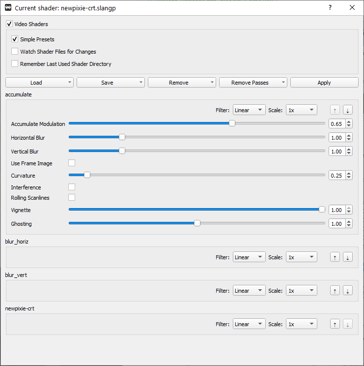 @EdBoatConnoisseur@DrRyanSkelton This is the setup I've been using lately (for GBA, but also console games), personally I think newpixie is the nicest looking "light" crt shader IF you have it set to Linear (very important) because it blurs the fuck out of the image in a way that I find pleasing while the grid effect is noticeable but not overwhelming.
