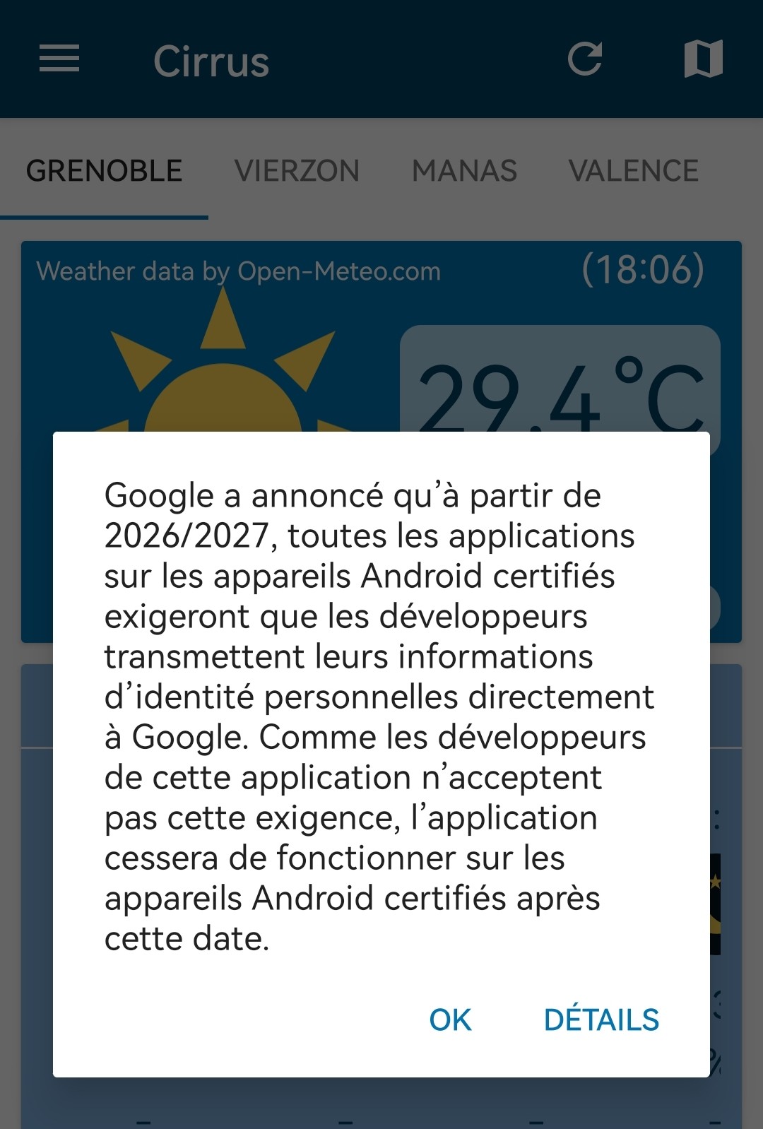 Alerte des développeurs de Cirrus, l'application libre de météo. Google devient de pire en pire, pour les utilisateurs comme pour les développeurs.