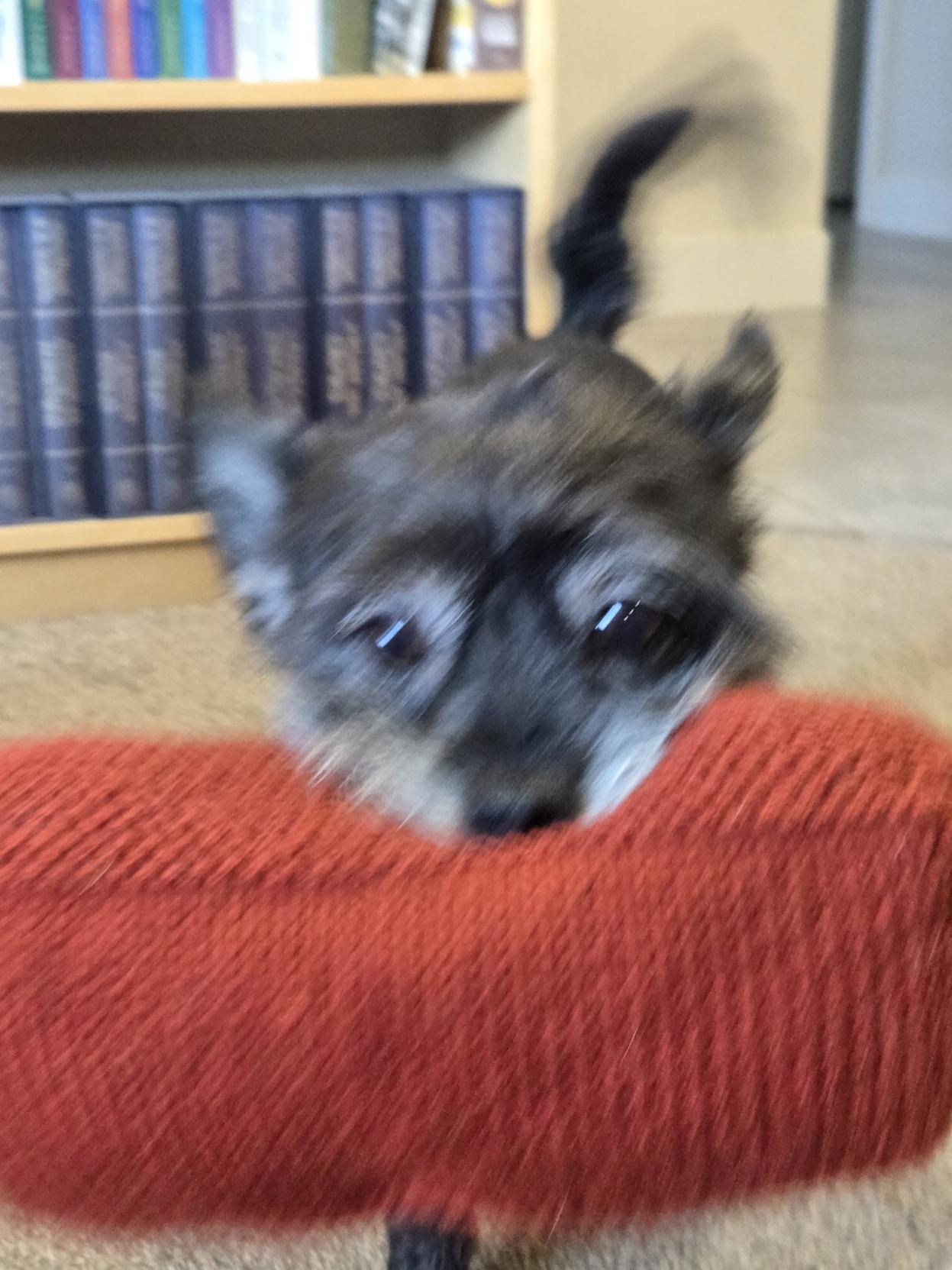 I made a knitted brick for stress relief, and Flicka got a hold of it. -