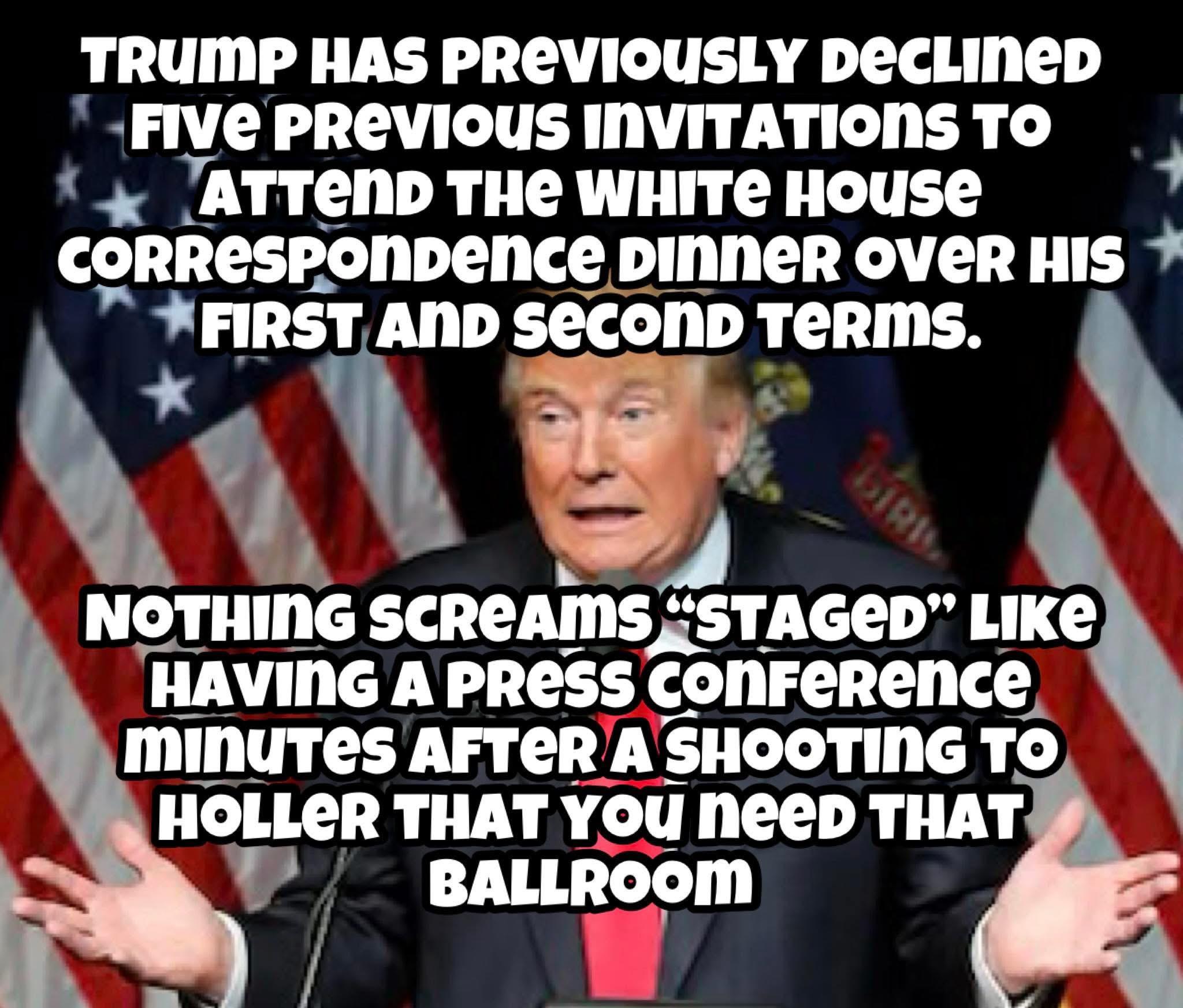 “Rather than focus on the safety of the hundreds of people in that room, Trump used his post-incident White House press briefing to argue that the shooting proved the need for his planned White House ballroom. ‘We need the ballroom,’ he said. A mass security scare at a press freedom dinner, and his first instinct was a real estate pitch.” - Really American