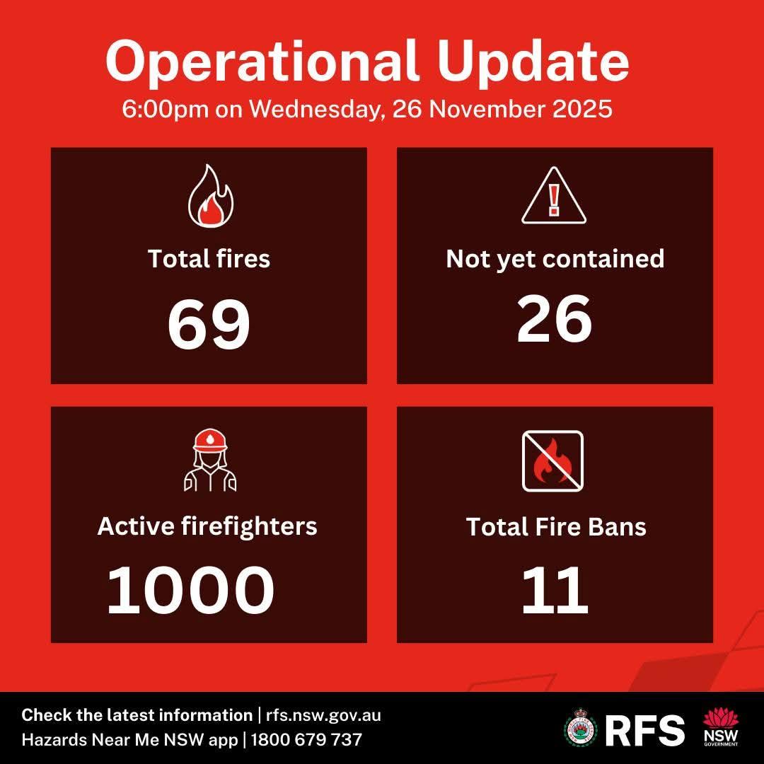 As of 6:00pm, Wednesday 26 November, there are 69 fires burning across NSW, with 26 yet to be contained. More than 1000 firefighters and incident management personnel are working in difficult conditions to strengthen containment lines and bring the fires under control.