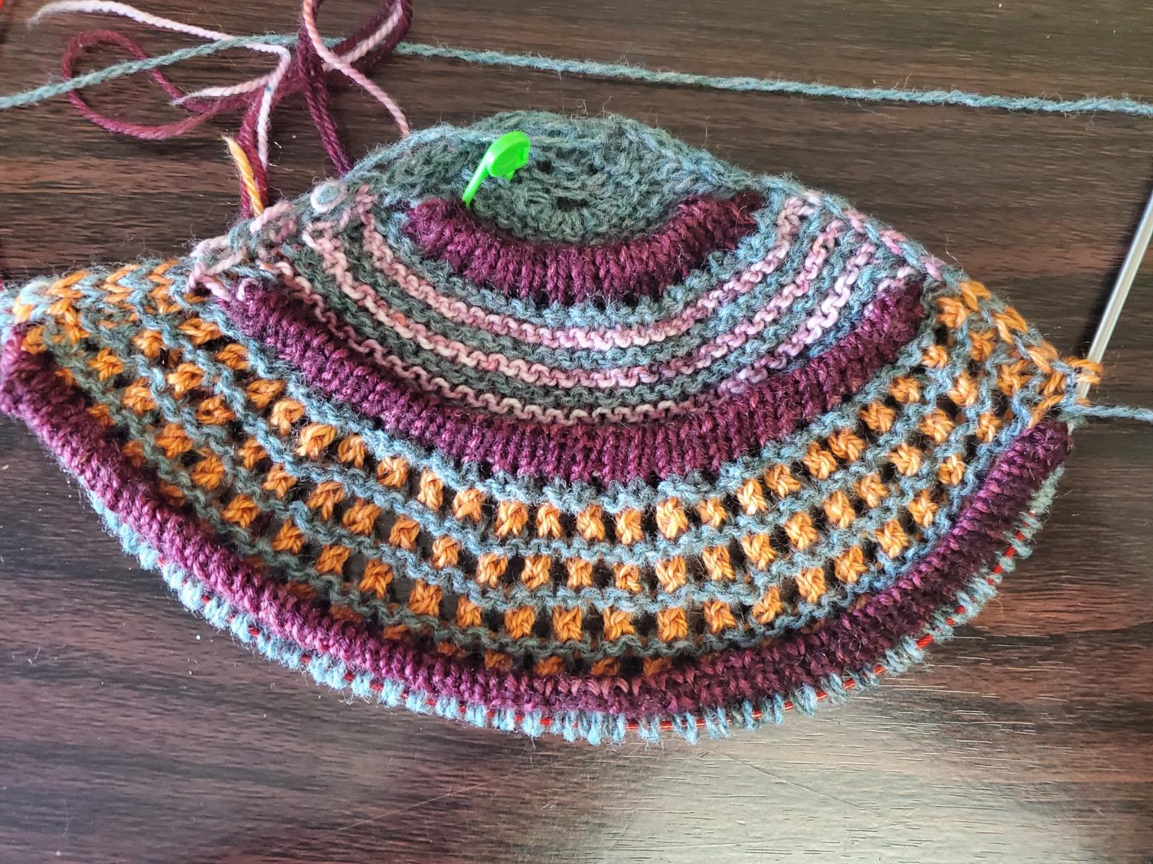 Tried for the brioche stitch for THREE AND A HALF DAYS!!!!! Still couldn't conquor it, although I think I finally understand what went wrong. Epic fail. Plus a color change. Plus a color order change. Finally, off to the races, yay!