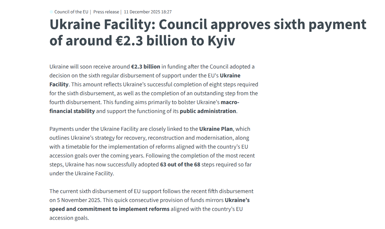 The EU Council has approved a €2.3 billion sixth tranche for Ukraine under the Ukraine Facility. This funding reflects Ukraine’s completion of eight required steps and progress on a step from the fourth tranche. The money is aimed at strengthening macro‑financial stability and supporting public administration.