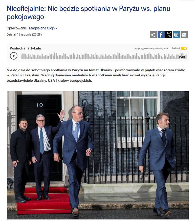 A planned peace plan meeting in Paris this Saturday will not take place, a source at the Élysée Palace says. Earlier reports had suggested high‑level talks between the U.S., Ukraine, France, Germany and the UK to discuss the American peace proposal. It’s now unclear if or when such a gathering will be rescheduled. European leaders, including Germany’s Chancellor Merz and Ukraine’s Zelensky, are still expected to discuss the status of negotiations in upcoming talks.