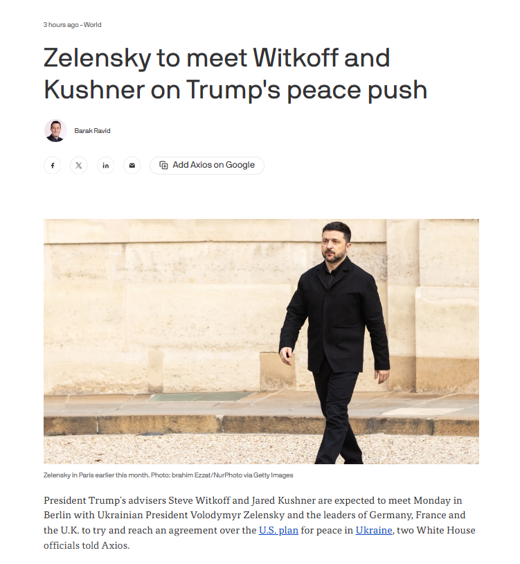 Axios reports the Trump administration is ready to offer Ukraine a legally binding security guarantee modeled on NATO’s Article 5, to be approved by Congress. The proposal would accompany a broader peace package discussed in Berlin, where Zelensky is set to meet Trump envoys Witkoff and Kushner alongside European leaders. Talks include security guarantees, reconstruction, and a potential demilitarized zone, with territorial issues still the main sticking point.