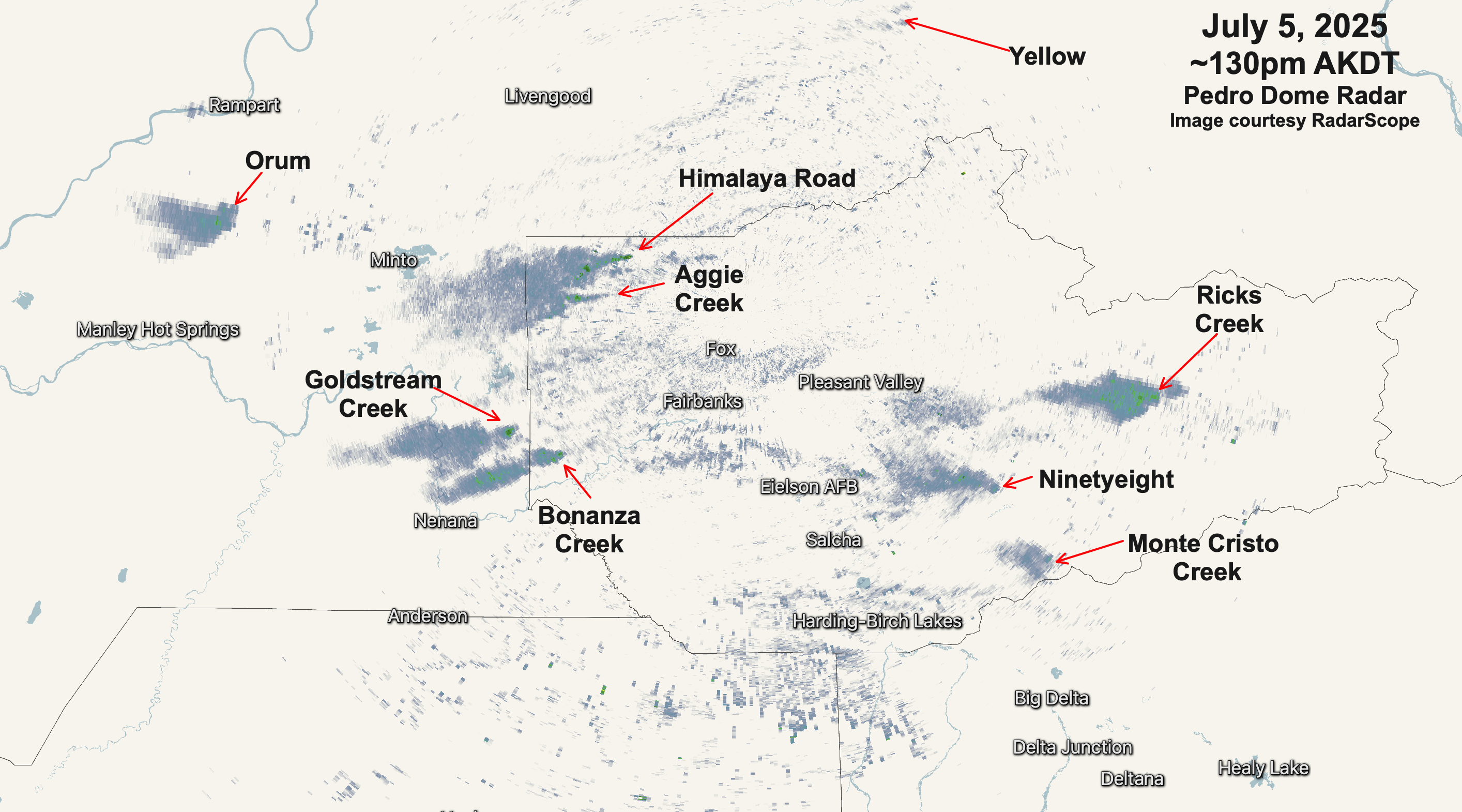Pedro Dome weather radar northeast of Fairbanks is lit up with plumes from a multitude of wildfires. Except for associated pyrocumulus, there are not any clouds around. Image courtesy RadarScope. @anisian@Climatologist49@BakerRL75 #akwx#Wildfire2025
