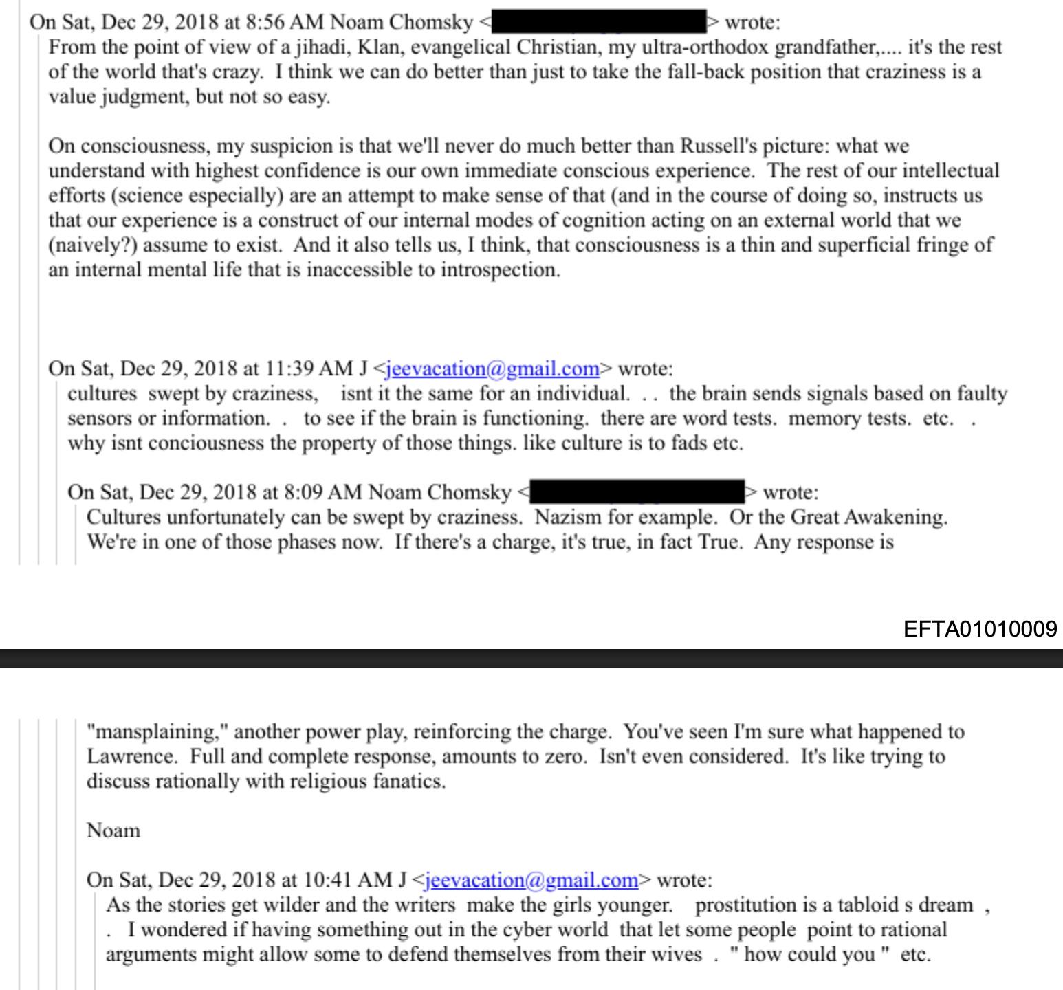 "Chomsky likens the outrage over Epstein's crimes in 2018 to a culture 'swept by craziness' like Nazism or the KKK.