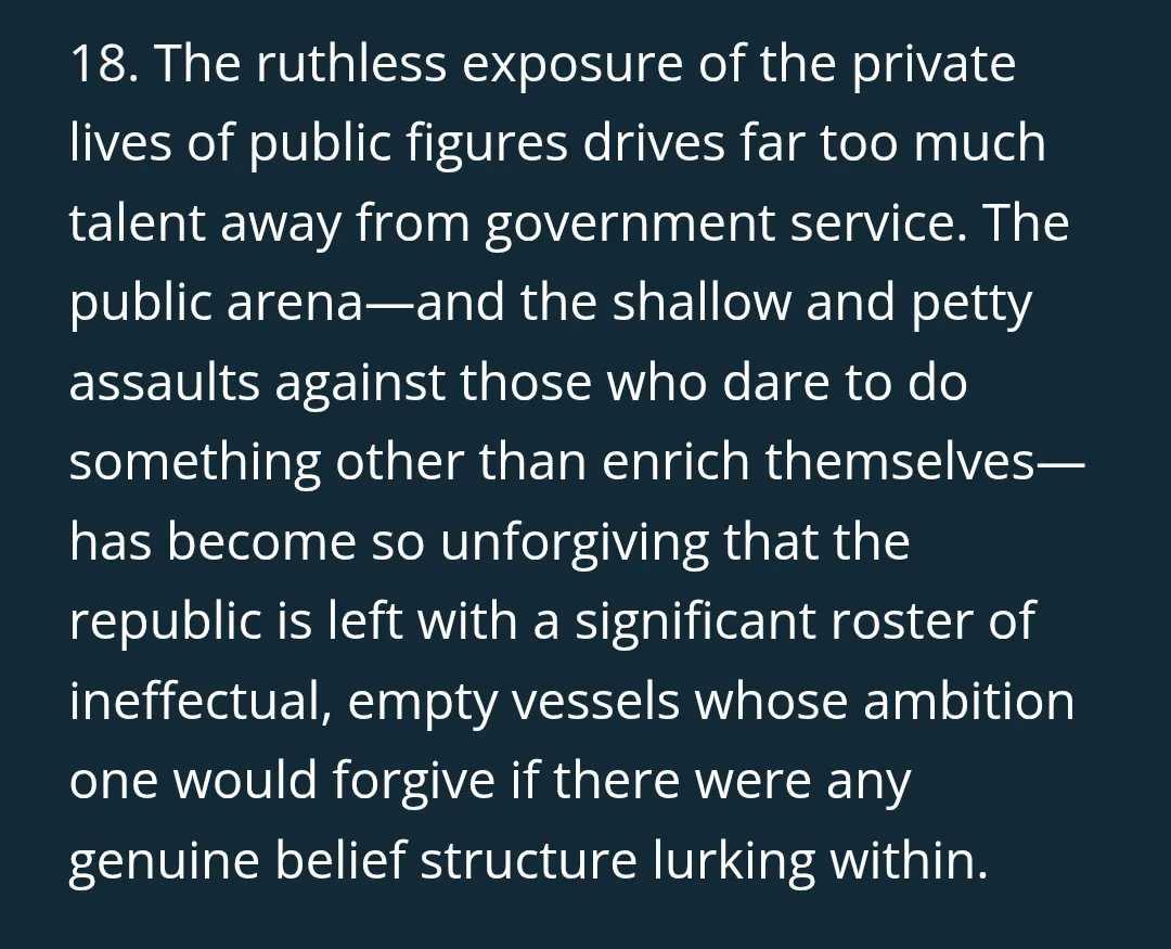 "Points 9, 18 and 19 go after accountability directly. Scrutiny of public figures is reframed as cultural sickness driving talent away from public life. The problem becomes people scrutinising, not people being scrutinised.