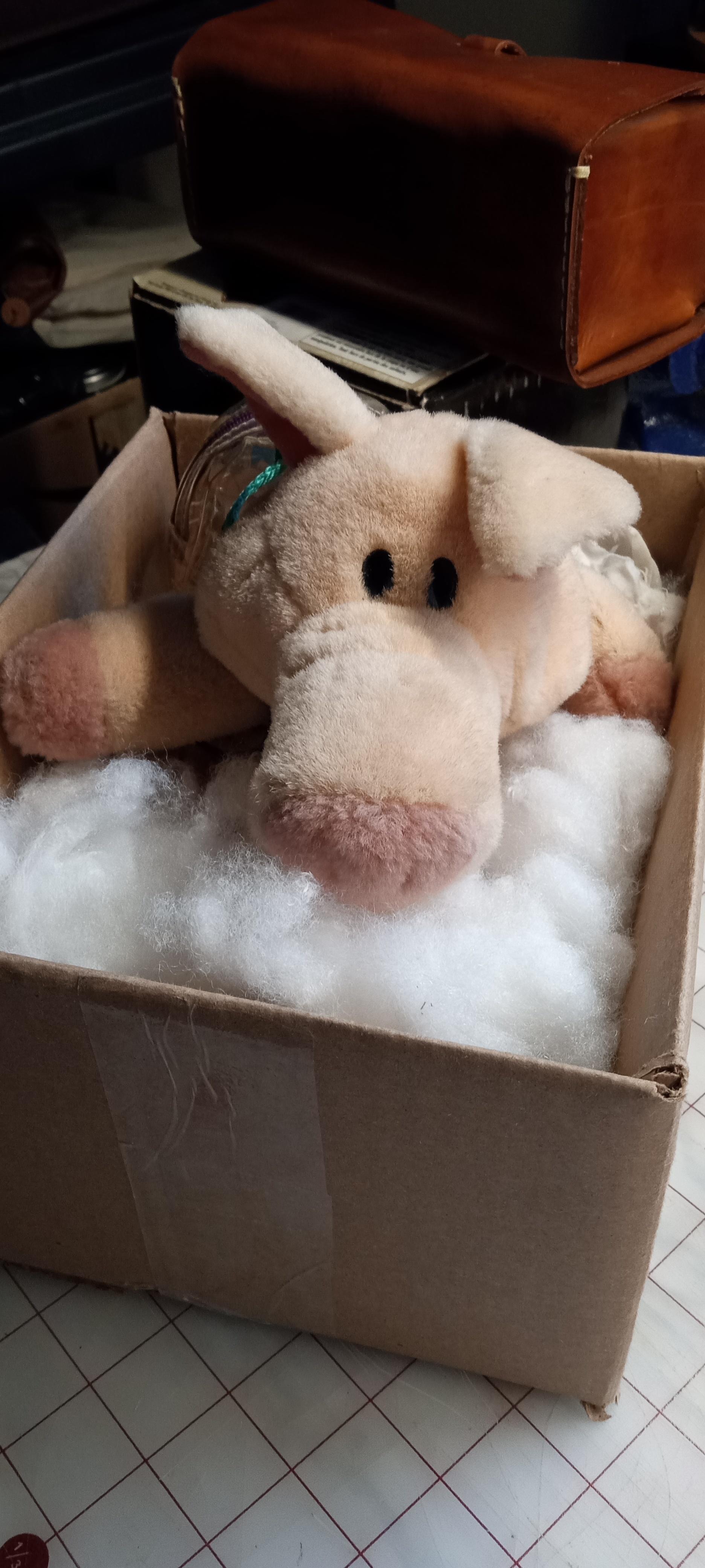Poor John. He sits in this box, among his guts, waiting for a new switch so he can speak out and identify himself to the world but, alas, I can find no replacement switch. Can you help John? #toy#StuffedAnimal#TalkingToy#JohnThePig#repair#ElectricSwitch