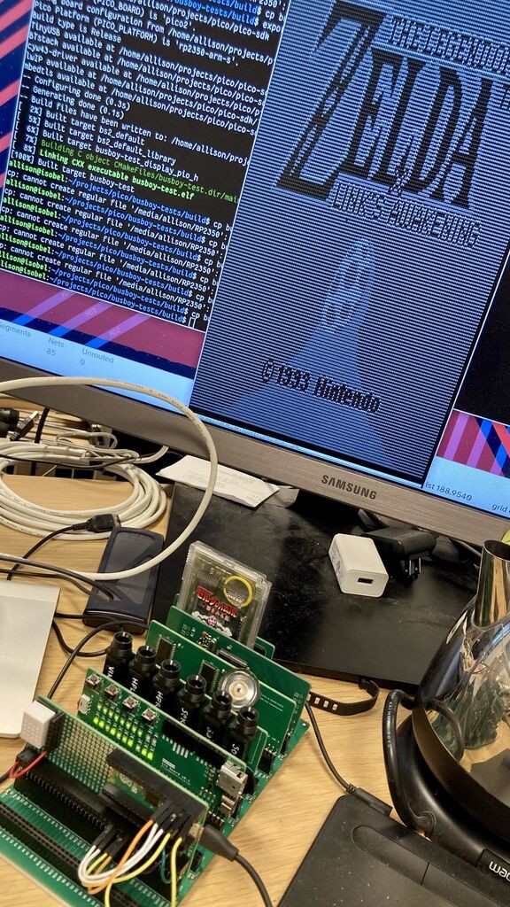 this is my prototype for a game boy on a bus backplane, inspired (obviously) by the rc2014 and https://smallcomputercentral.com/ (among others). the backplane connectors break out every pin of the Game Boy SoC (the DMG CPU, to be specific), so you can pop in/remove cards that interface with any gb peripherals, or plug into the address/data buses directly. in the 2nd photo i'm using a pico 2 to convert the game boy's video out to ascii (to send over serial for debugging purposes)