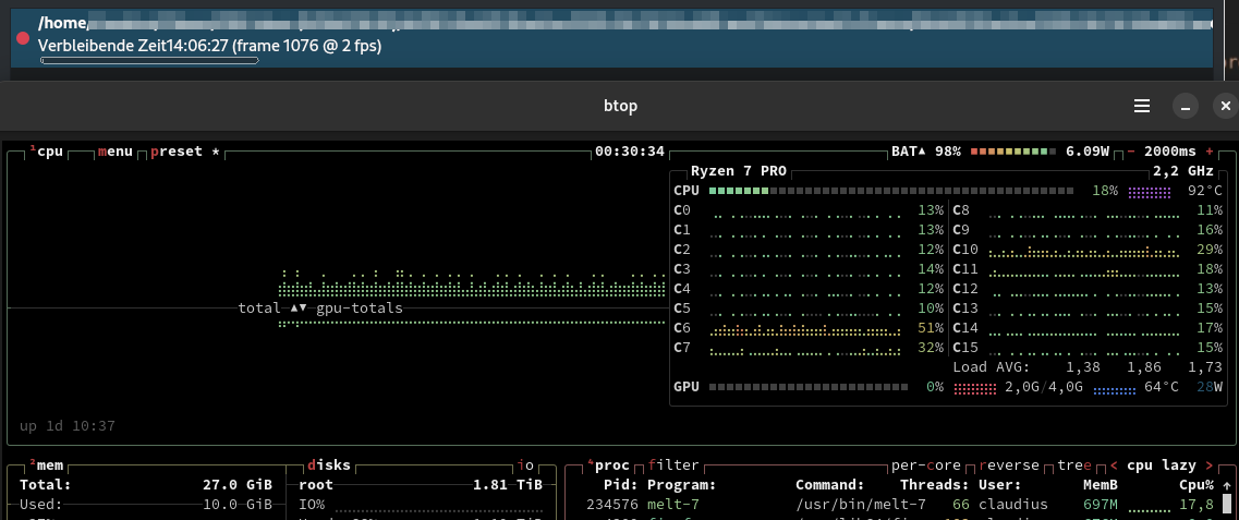 Rendering to AV1 in @kdenlive only uses very little CPU at any given time (screenshotted 17% is the absolute maximum I've seen. It alternates between 7% and 17%). I wonder how long it will take to encode one hour of video this way. Not sure what the bottleneck is, here.