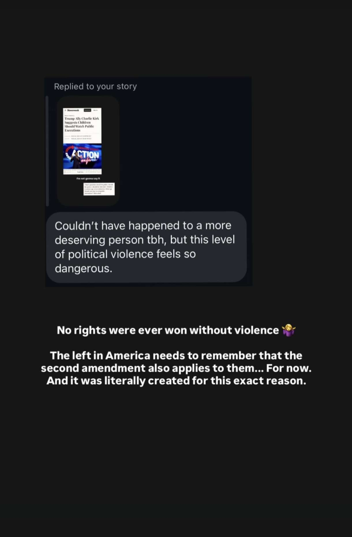 Clara advocated violence against conservatives and babies, the second part more often than youd think and on her main. If you remember, I was a fan before the extreme antinatalism far before Charlie kirk and the trump election